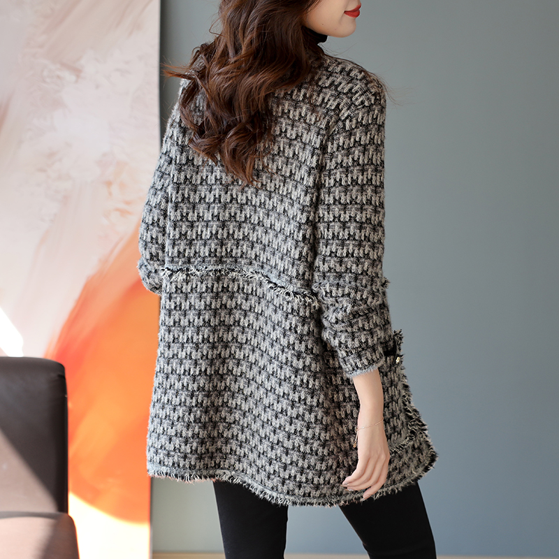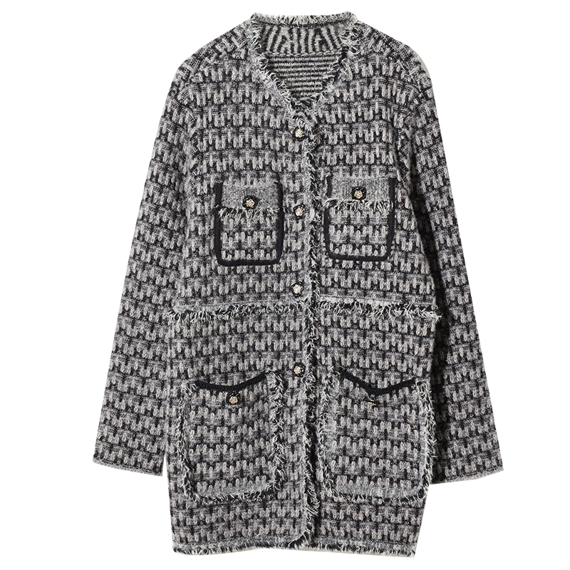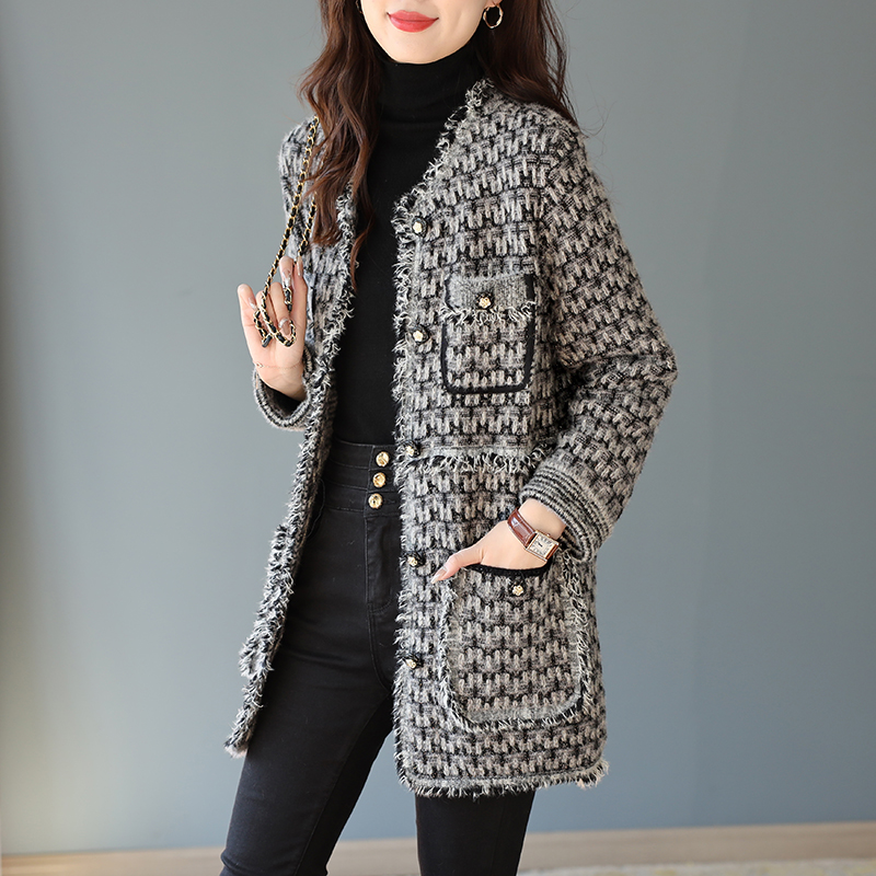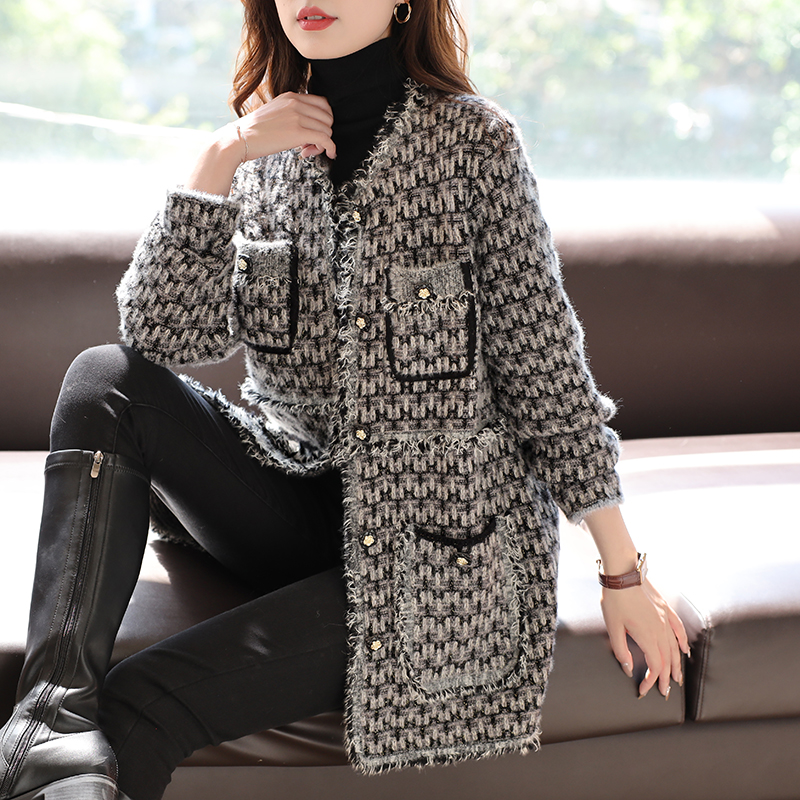 宝诗黎小香风格子亮丝中长款针织外套女新款2025时尚流苏开衫上衣