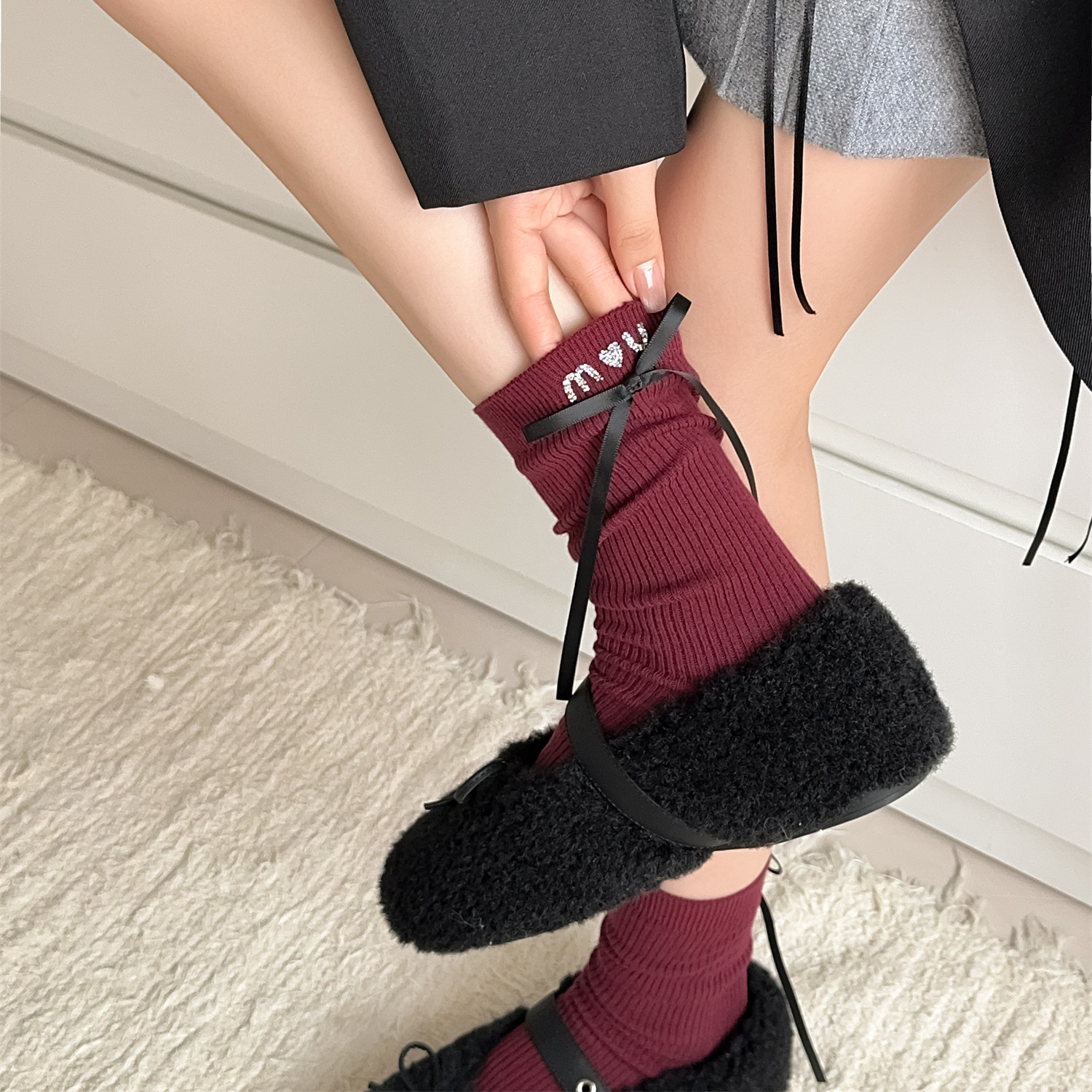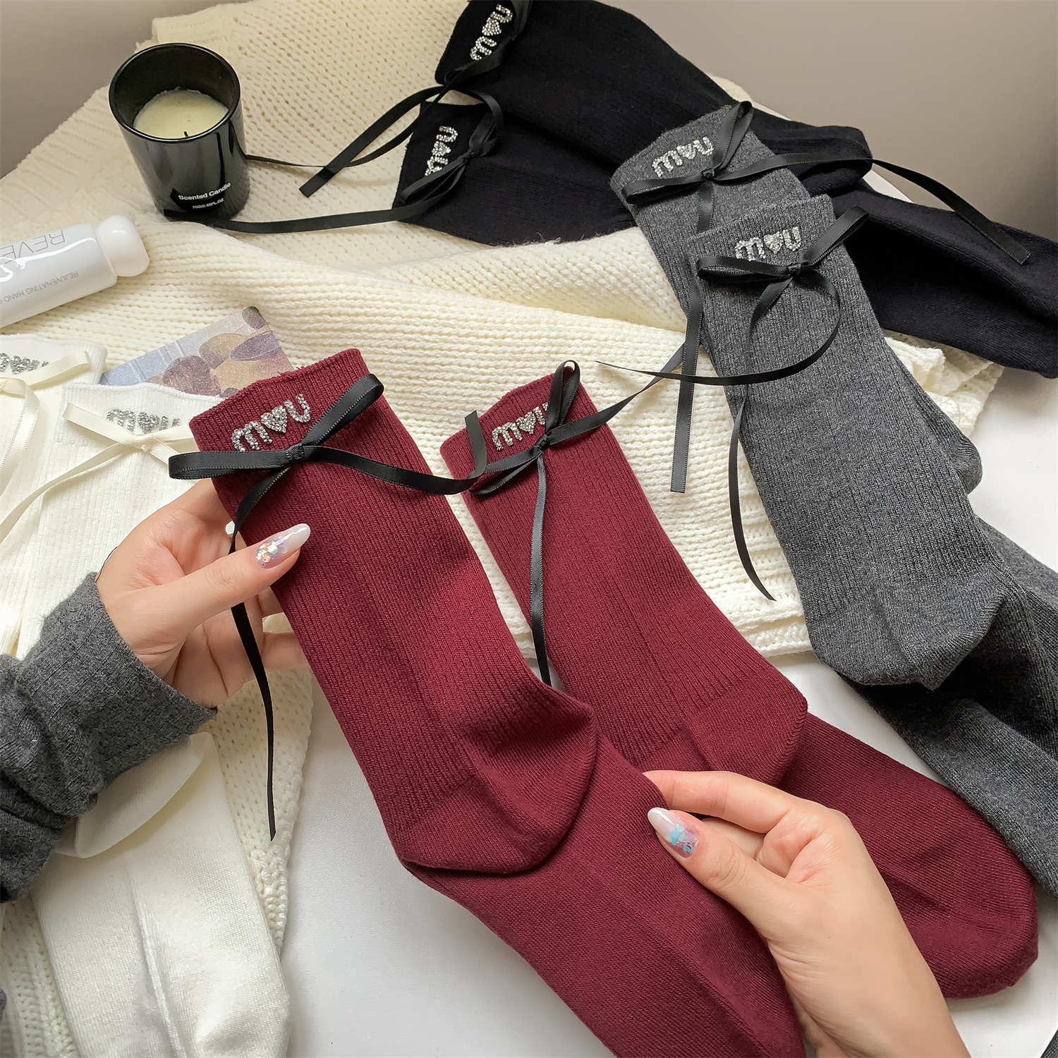 秋冬奢华名媛淑女纯棉堆堆袜 带钻蝴蝶结女士中筒袜棉袜装饰袜