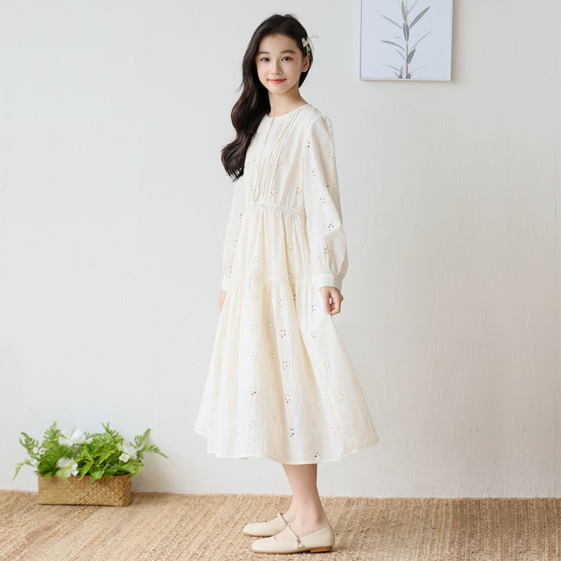 中大童女童连衣裙春秋款长袖镂空长裙2025新款儿童女孩沙滩公主裙