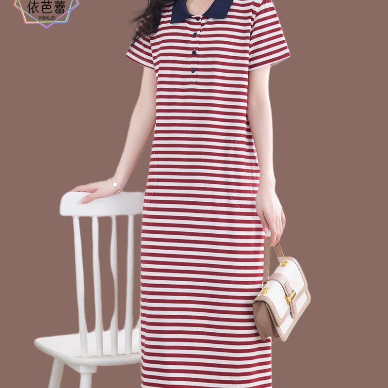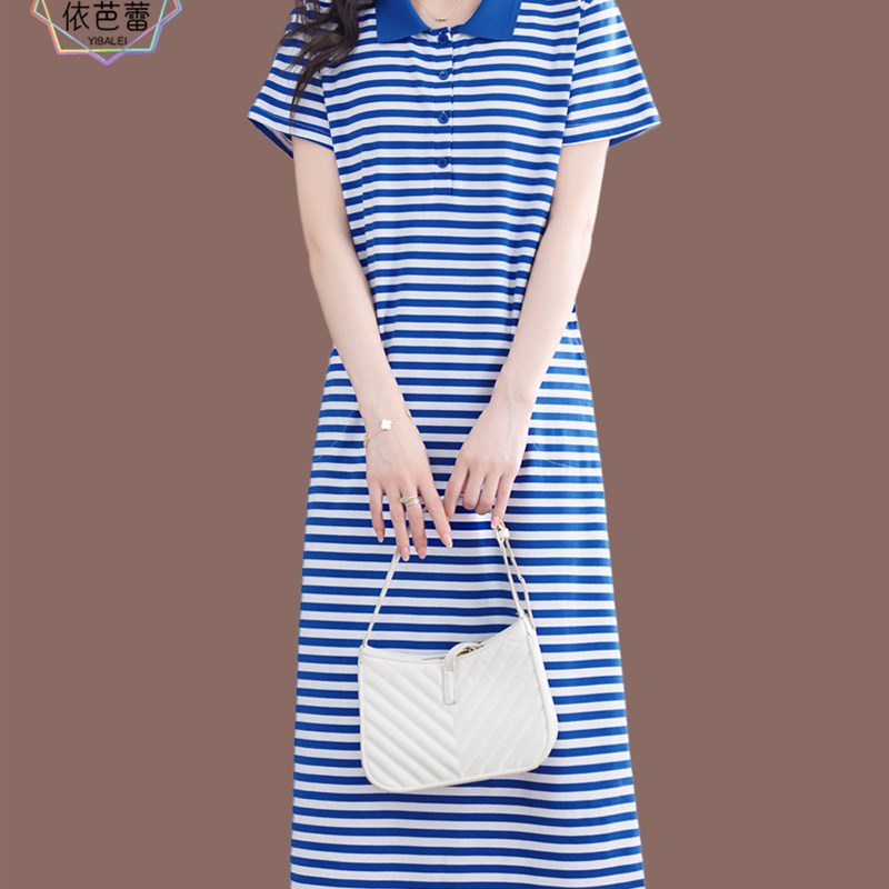 夏季女装纯棉绸连衣裙宽松针织短袖t恤中年妈妈长款过膝条纹裙子