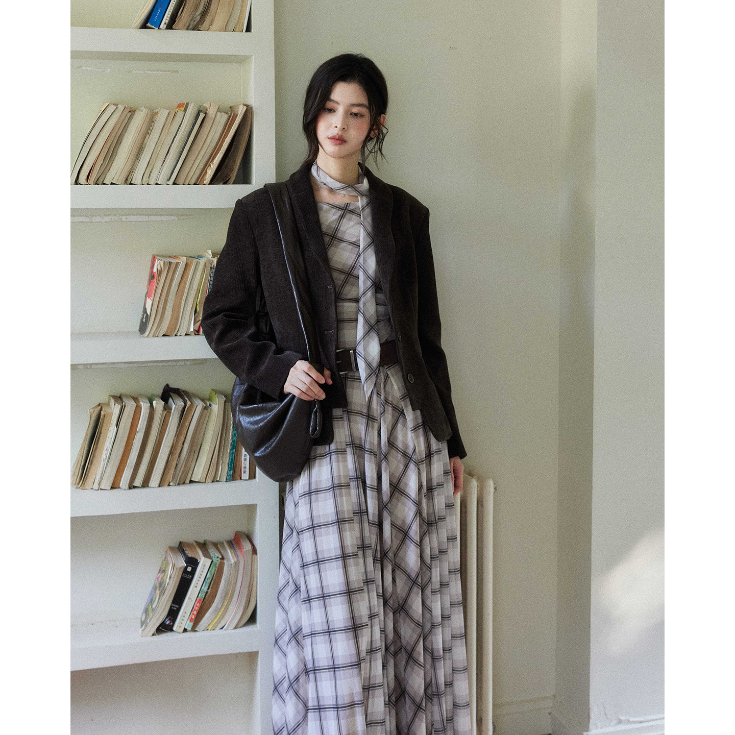 贰羊设计【墨染】复古弹力格子连衣裙女不规则收腰设计感大摆长裙