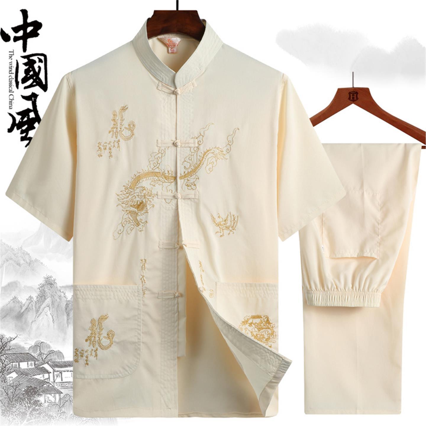 中老年人唐装短袖套装男士夏季爸爸中式立领衬衫中国风爷爷装汉服