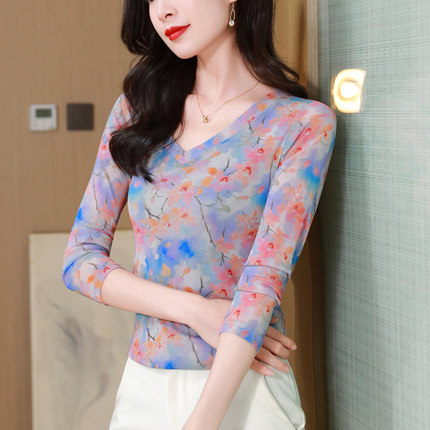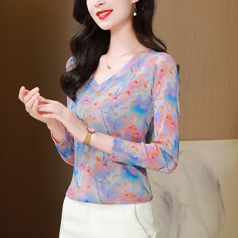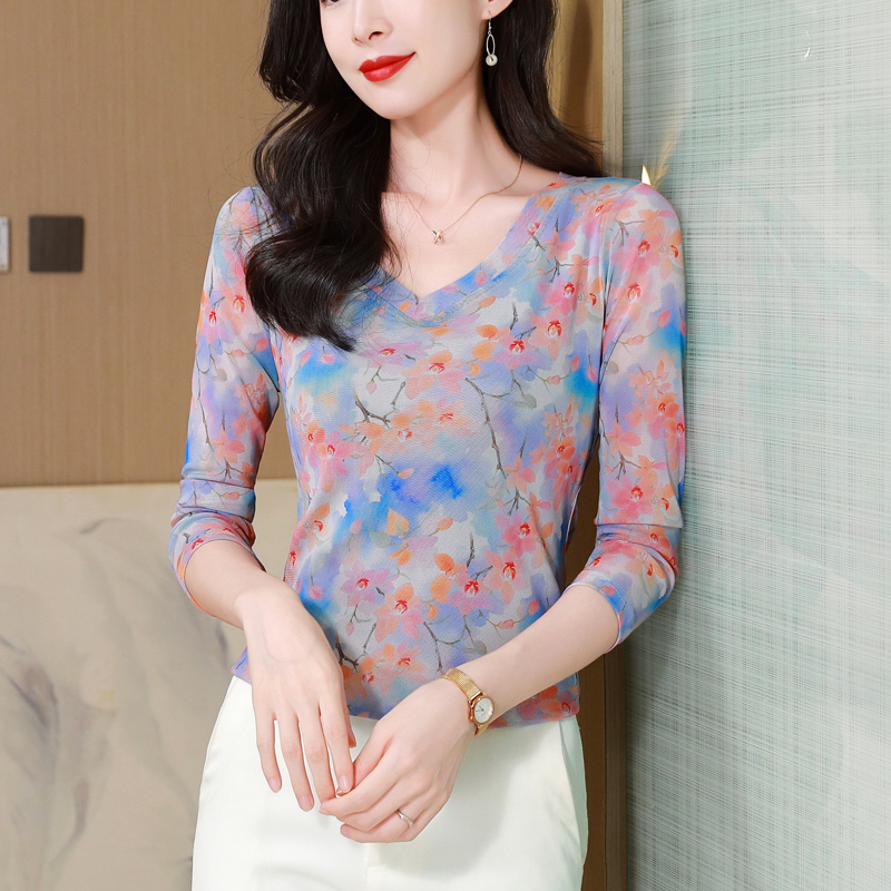 韩版V领网纱打底衫女秋装新款时尚印花长袖T恤妈妈洋气百搭上衣潮