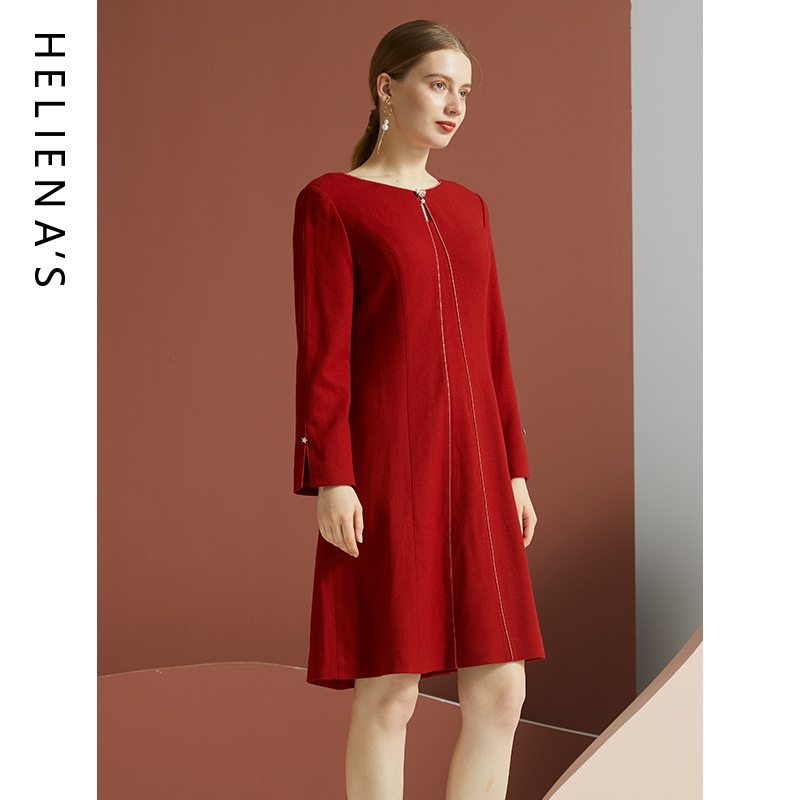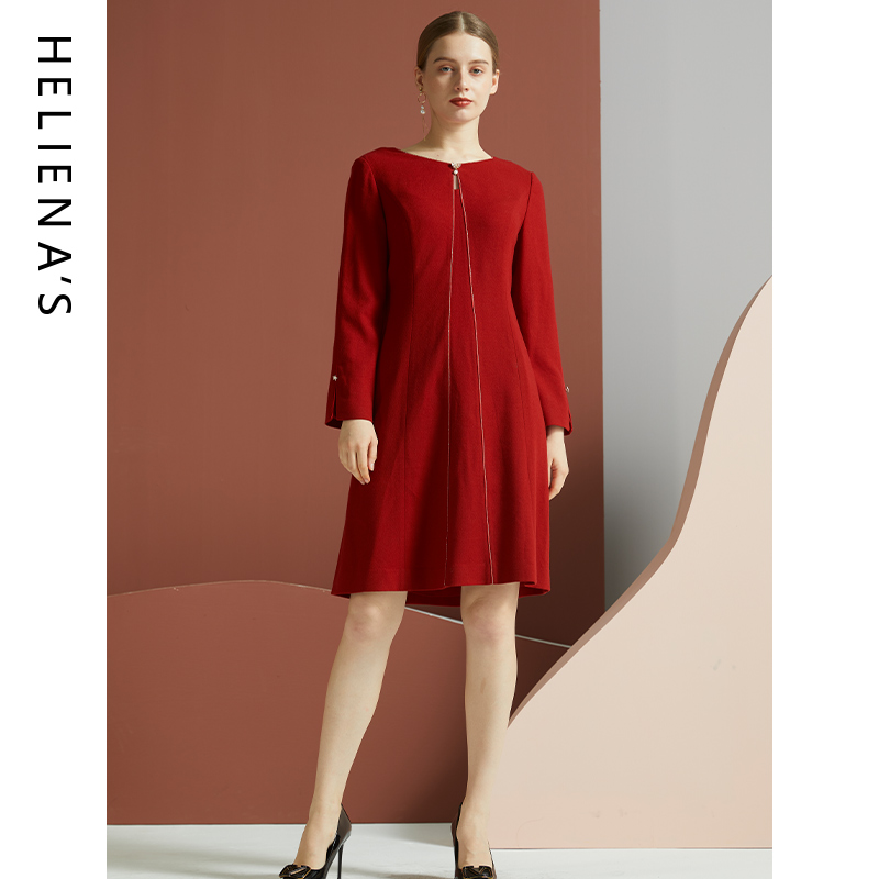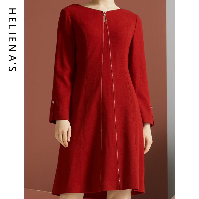 海兰丝2024秋冬新款商场同款圆领中长款修身羊毛内搭红色连衣裙女