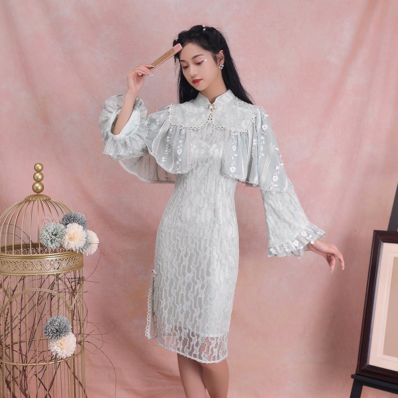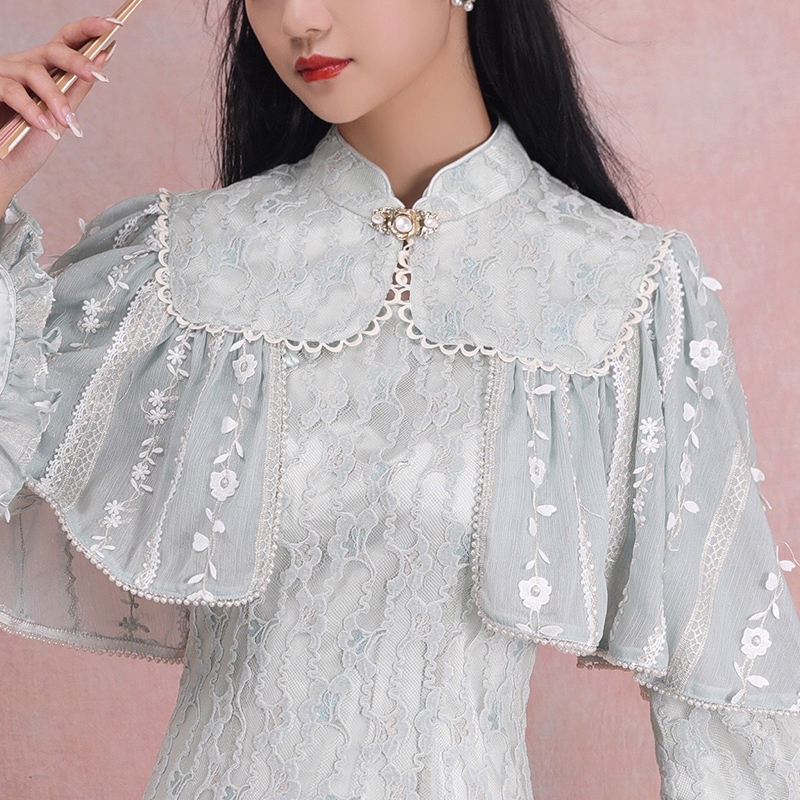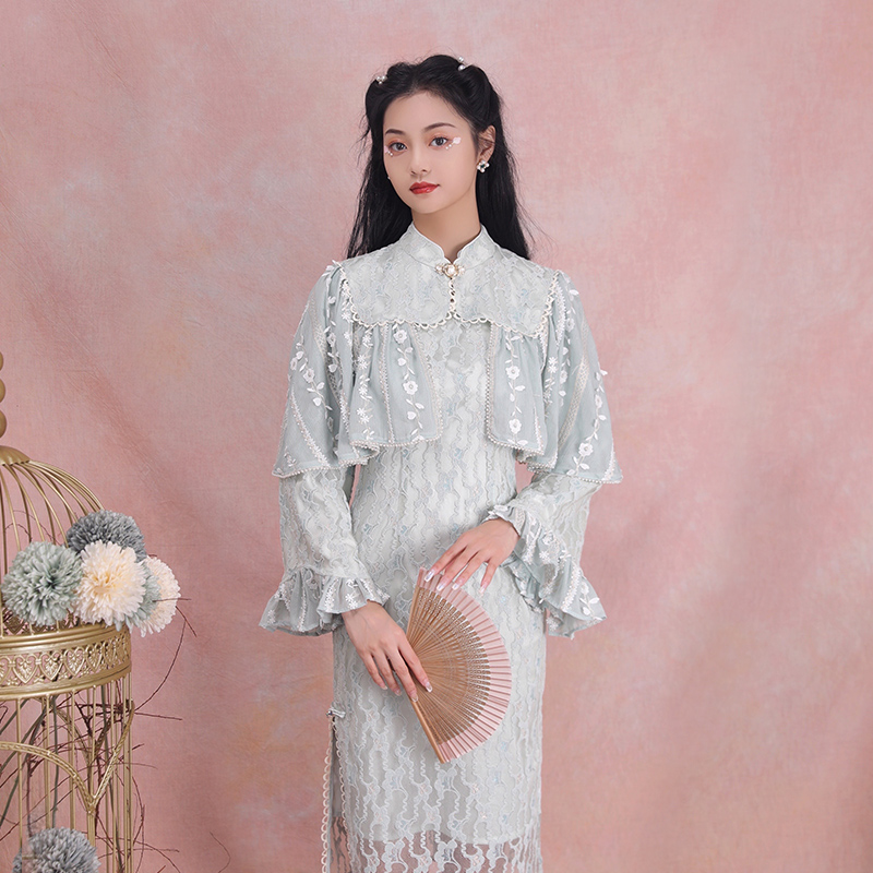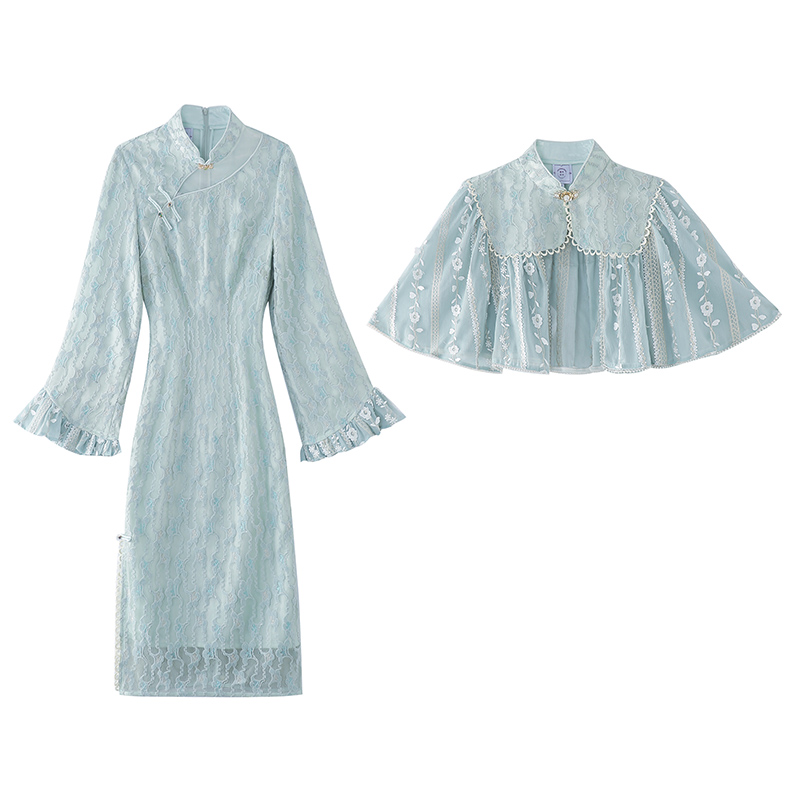 槿爷水中月2024年新款蕾丝刺绣复古温柔仙女连衣裙改良版旗袍套装
