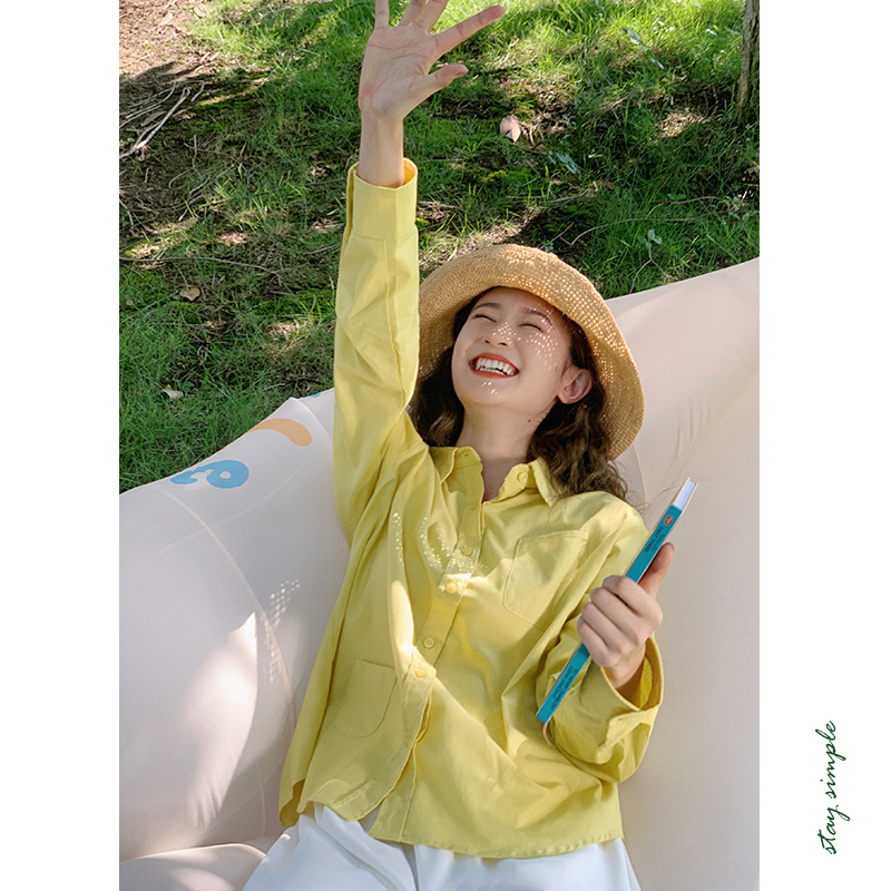花吉B496银杏黄宽松棉麻长袖衬衫女2025新款秋经典口袋基础衬衣