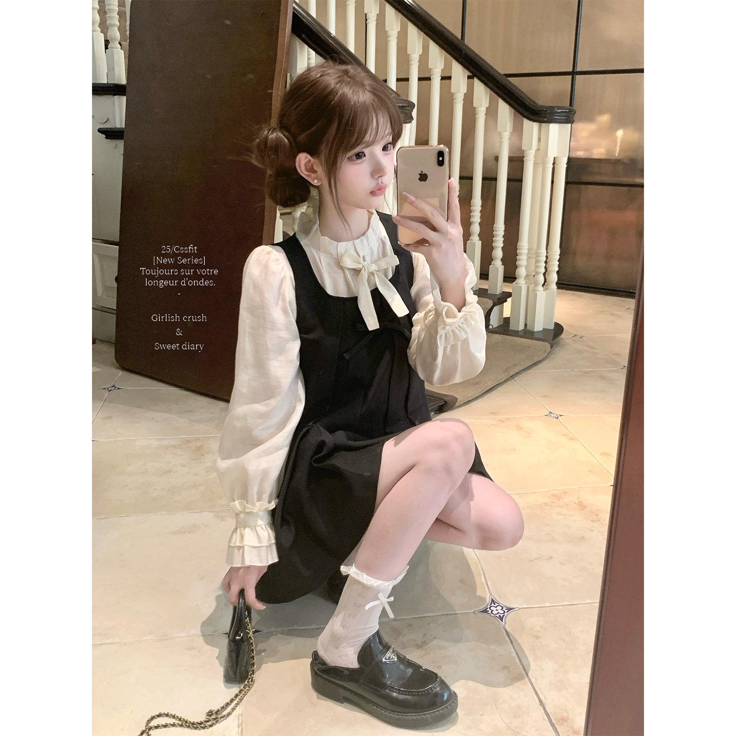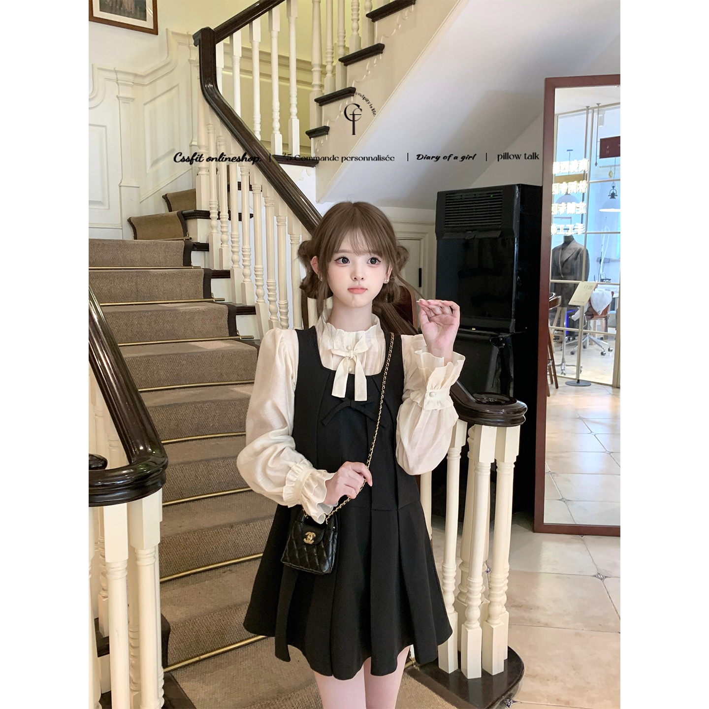 迟伞伞黑蝴蝶结背心裙立领衬衫