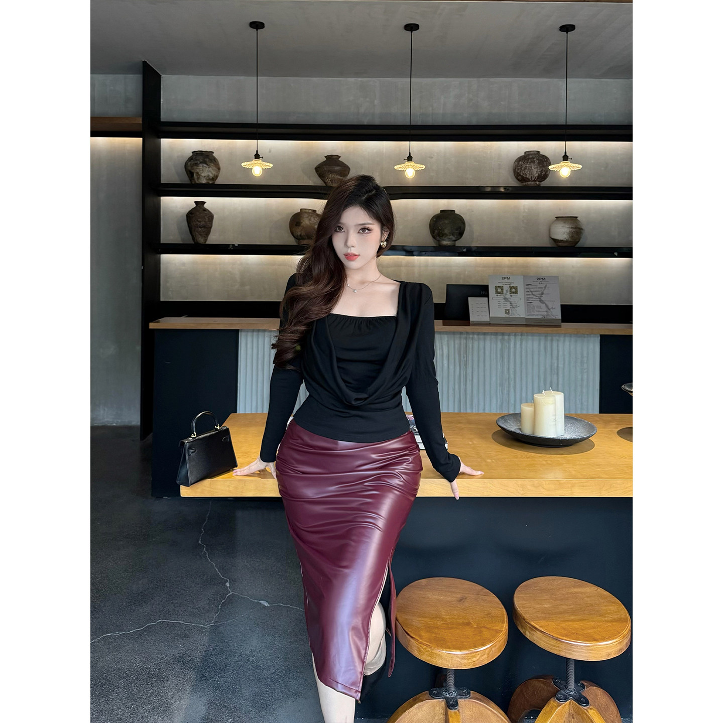 B-babes【酒杯裙】韩系纯欲性感OL高腰显瘦中长款pu皮包臀半身裙