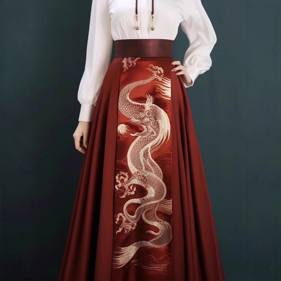 新中式国风女装高端复古酒红色半身裙马面裙龙年本命年百褶长裙子