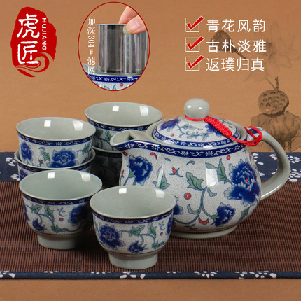 虎匠青花瓷陶瓷茶壶带滤网
