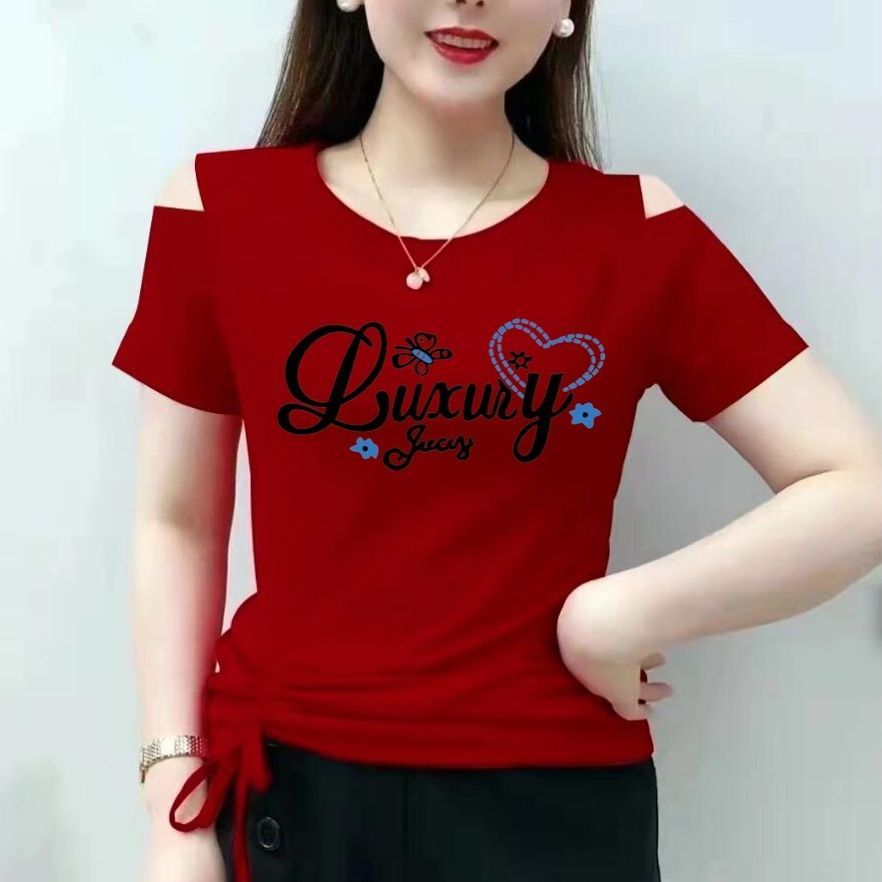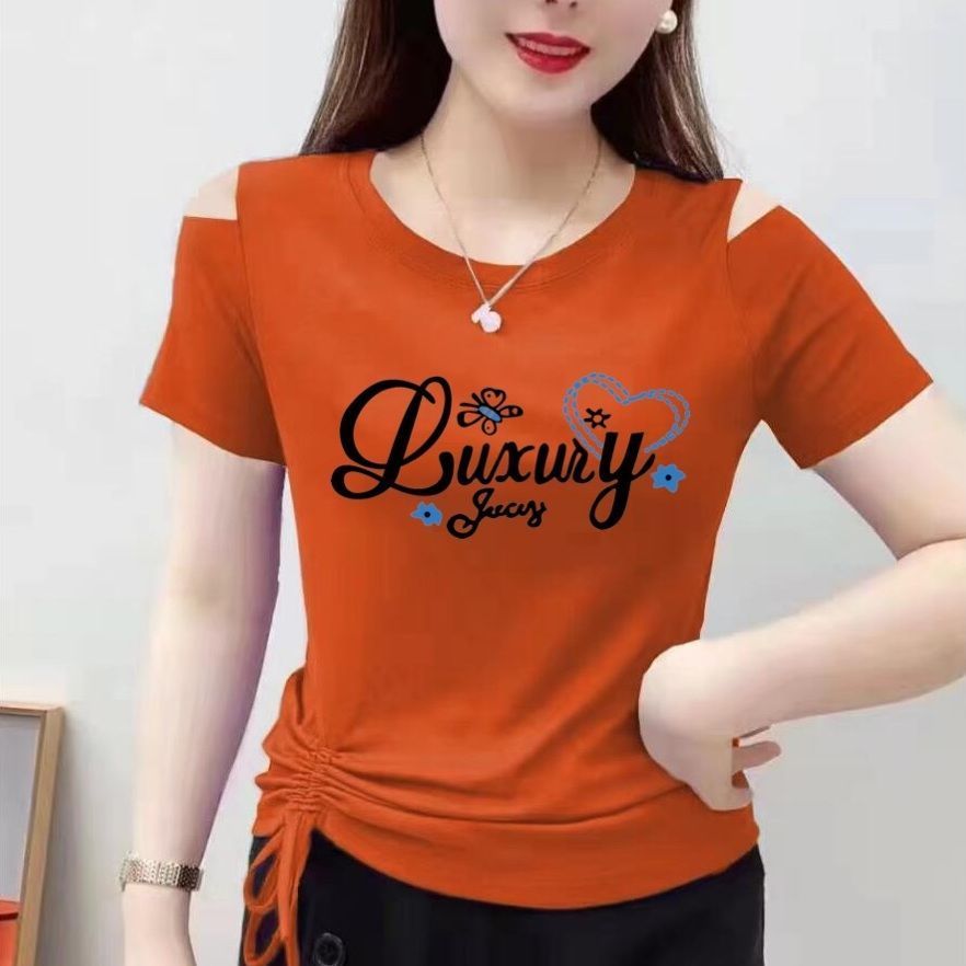 侧抽绳显瘦大码夏女士v领露肩短袖t恤遮肚子显瘦2025纯棉体恤上衣