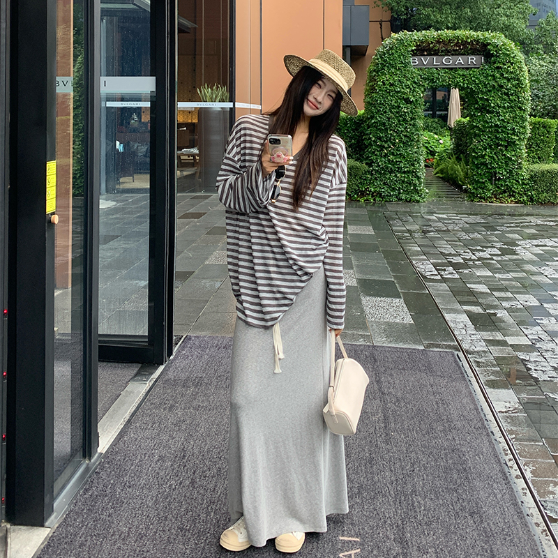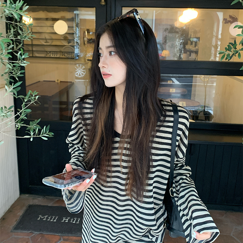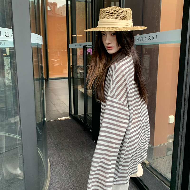 拉夏贝尔冰丝条纹防晒罩衫女夏薄款长袖t恤2025新款外搭宽松上衣
