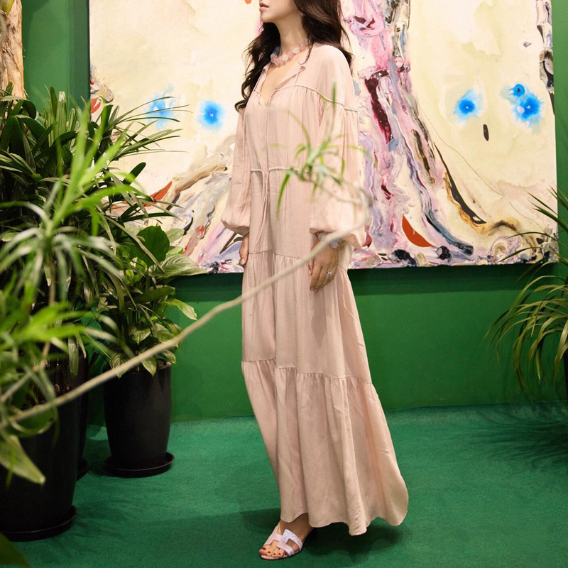 朱珠同款粉色v领系带长袖连衣裙女秋季新款宽松温柔风灯笼袖长裙