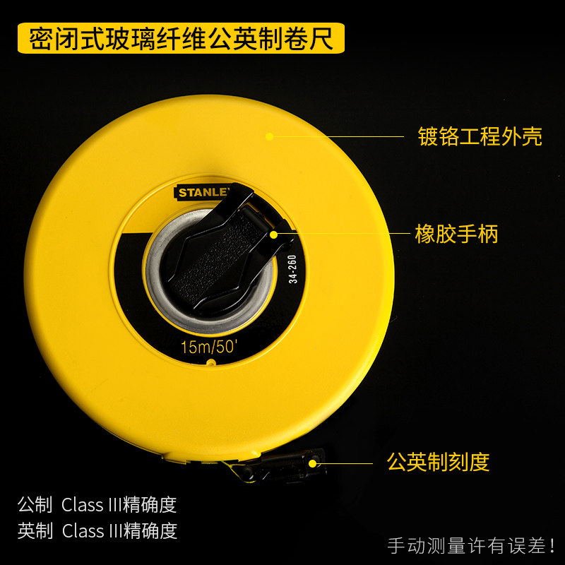 史丹利密闭式玻璃纤维公英制15m30m50m34260-8米软卷尺软皮尺软尺