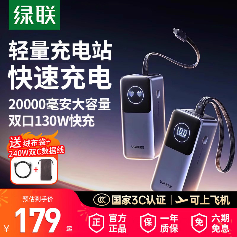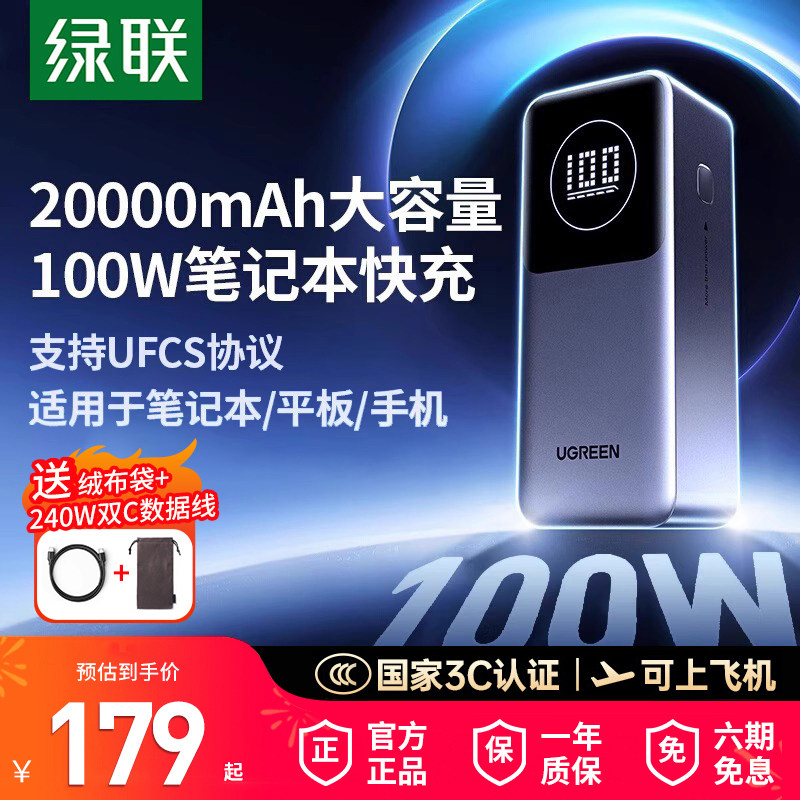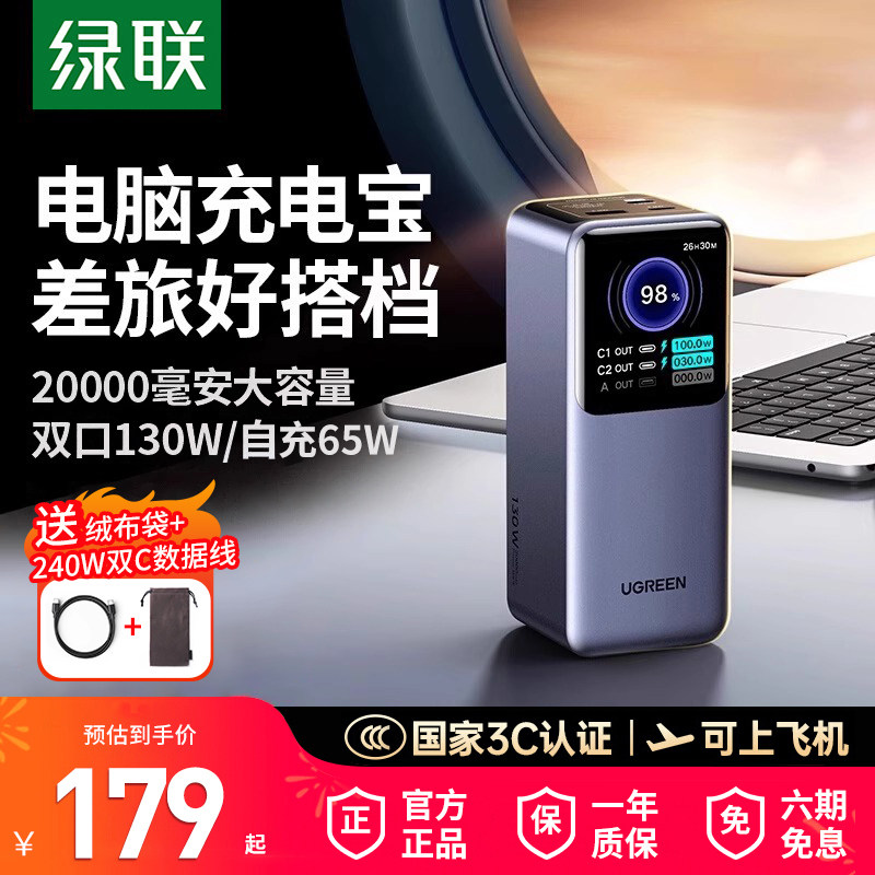 【3C认证】绿联2025新款130W电脑充电宝100W大功率20000毫安大容量移动电源适用iPhone手机Typec快充可上飞机