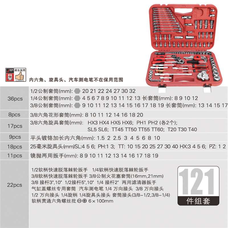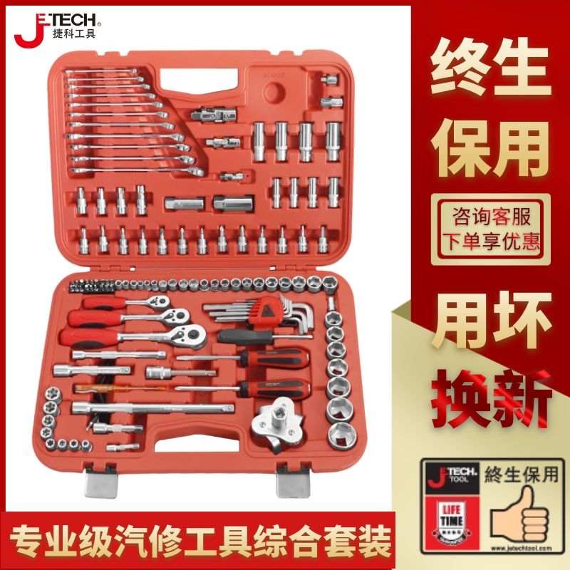 捷科工具121件汽修工具组套 多功能套筒棘轮扳手套装车载工具箱