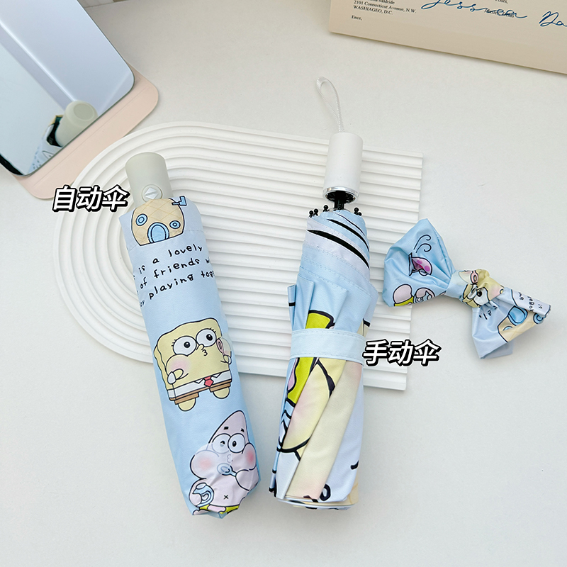 海绵宝宝全自动晴雨伞三折折叠雨伞黑胶涂层防晒防紫外线晴雨两用