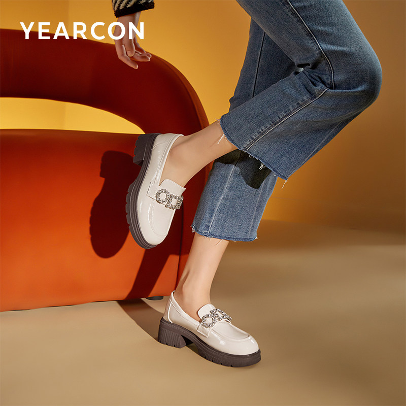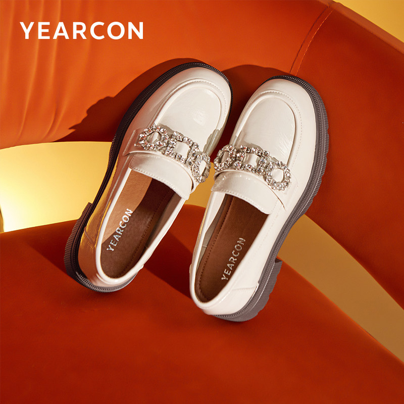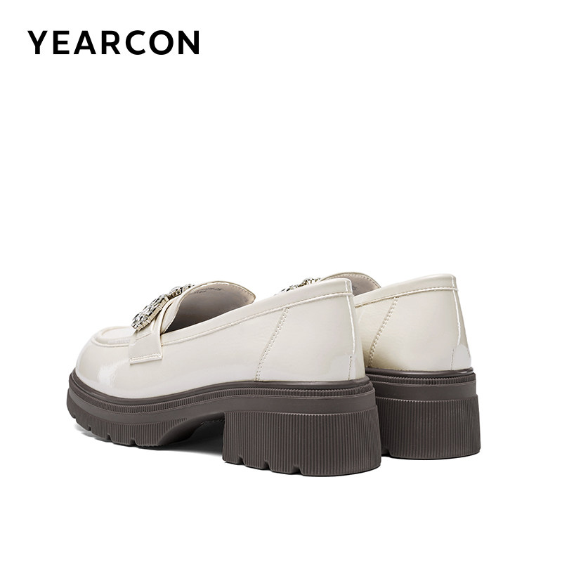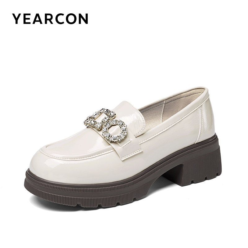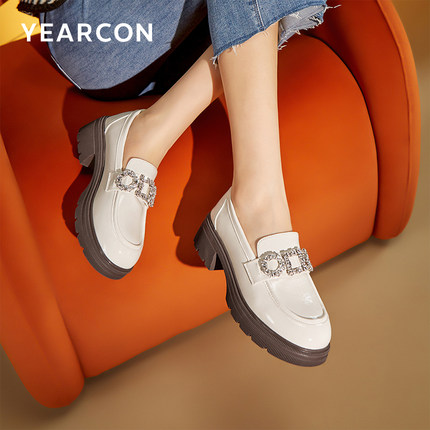 意尔康官方品牌店女鞋水钻漆皮小皮鞋女法式粗跟英伦风工作乐福鞋