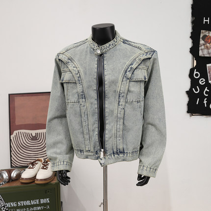 美式高街洗水做旧解构拼接痞帅牛仔夹克男士潮牌圆领拉链机车外套