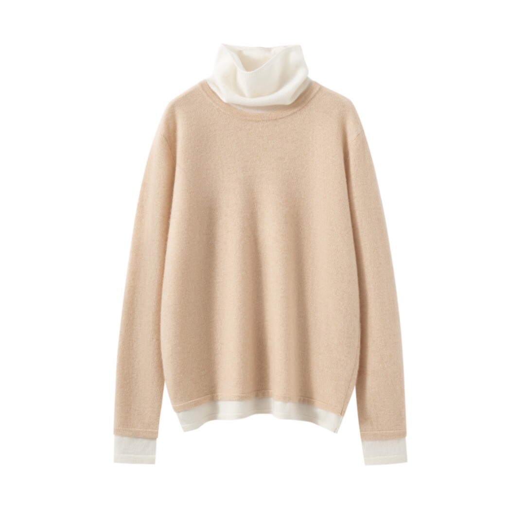 卷边圆领假两件纯山羊绒衫女秋冬针织套头宽松毛衣打底