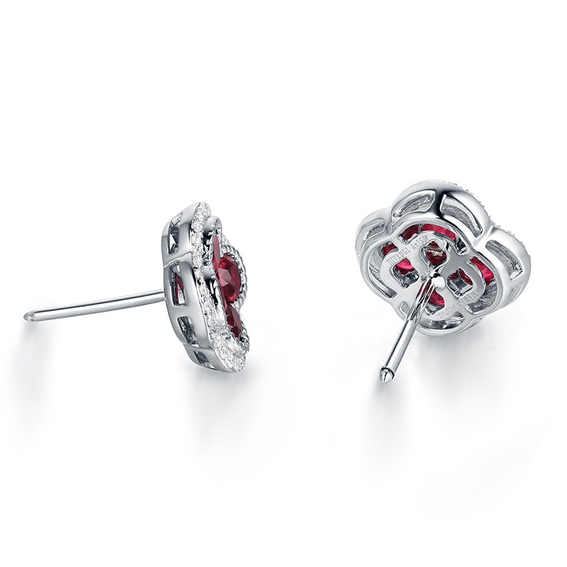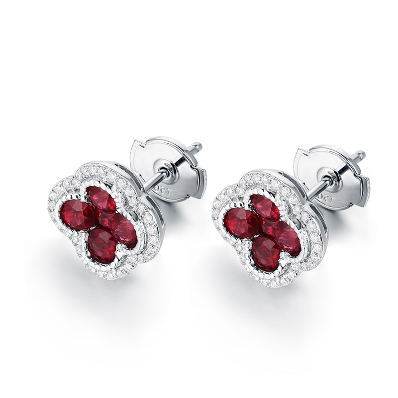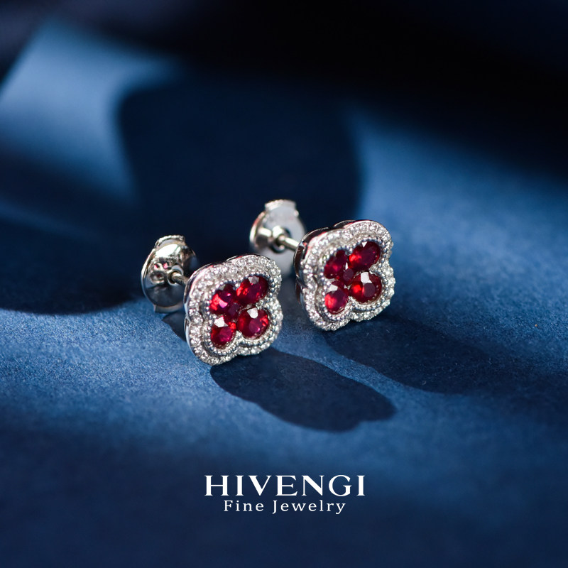 海梵纪珠宝 1克拉天然缅甸鸽血红红宝石耳钉钻石四叶草彩宝耳环
