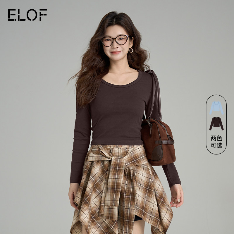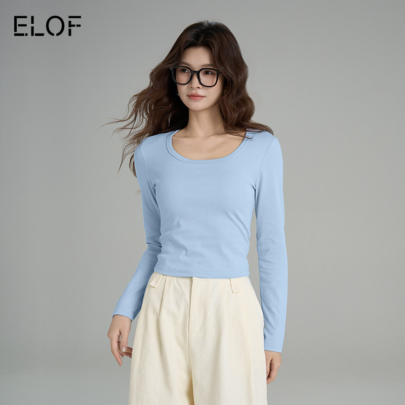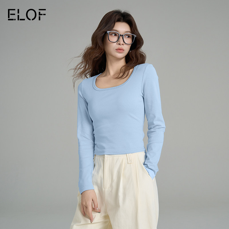 ELOF纯色U领V领长袖T恤女秋冬打底上衣