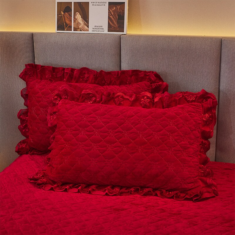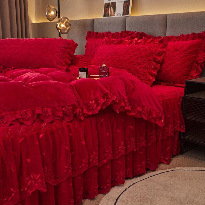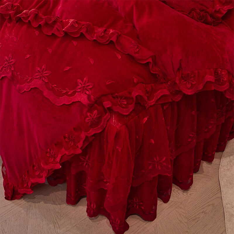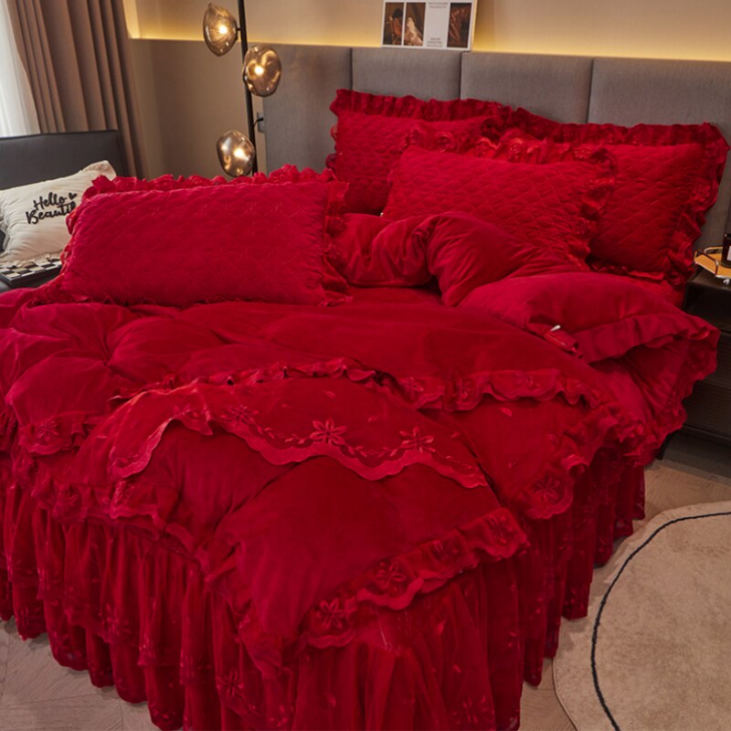 冬季加厚牛奶绒床上四件套夹棉床裙款珊瑚绒红色结婚被套加绒床单