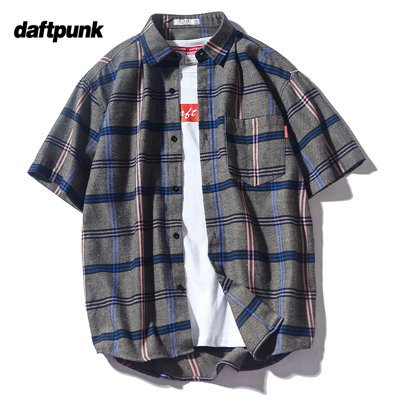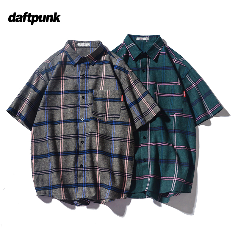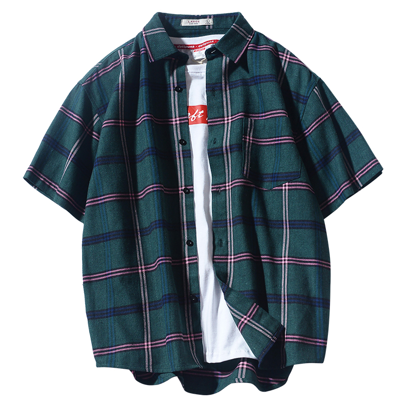 格子短袖衬衫男女夏季潮ins港风日系五分袖衬衣宽松大码半袖外套