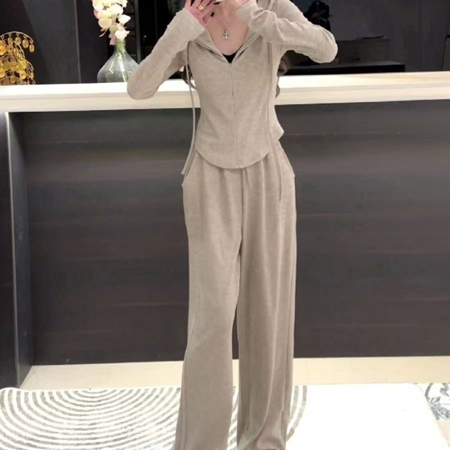 休闲流行休闲套装秋冬季新款纯色拉链短款连帽开衫卫衣两件套女装