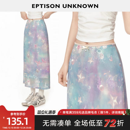 EPTISON半身裙女2025夏季新款高腰a字独特清新印花蓝色网眼薄裙子