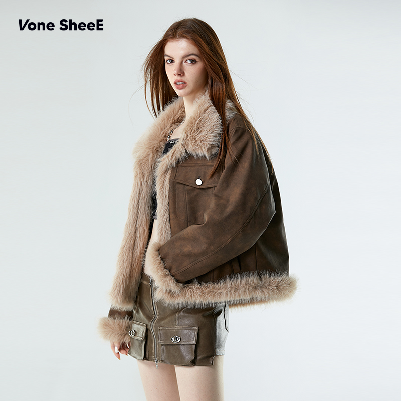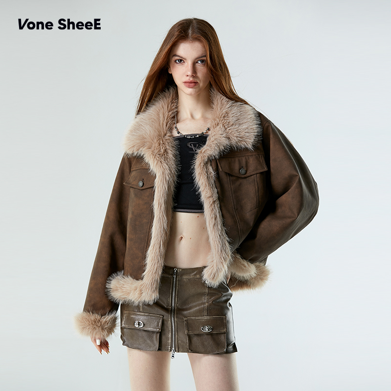 Vone SheeE美式复古毛毛短外套冬2025新款皮草机车服女式皮毛一体