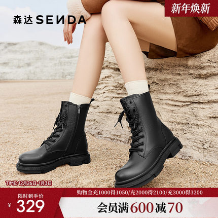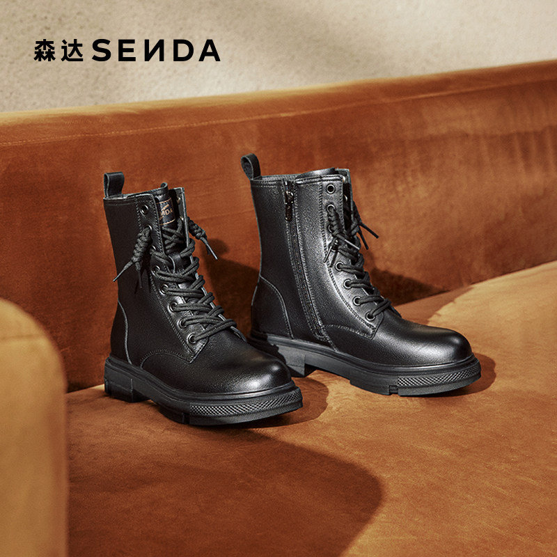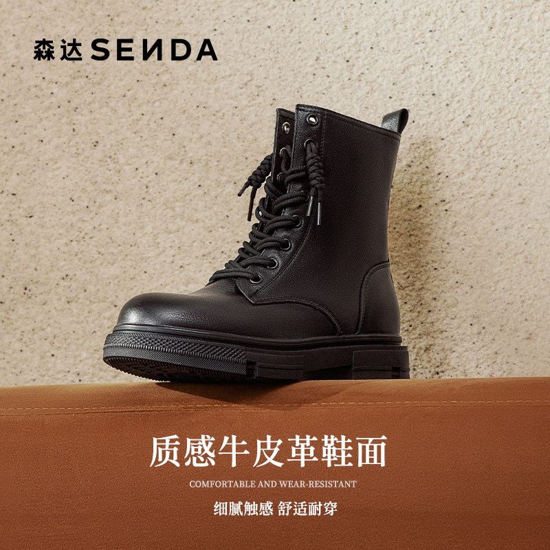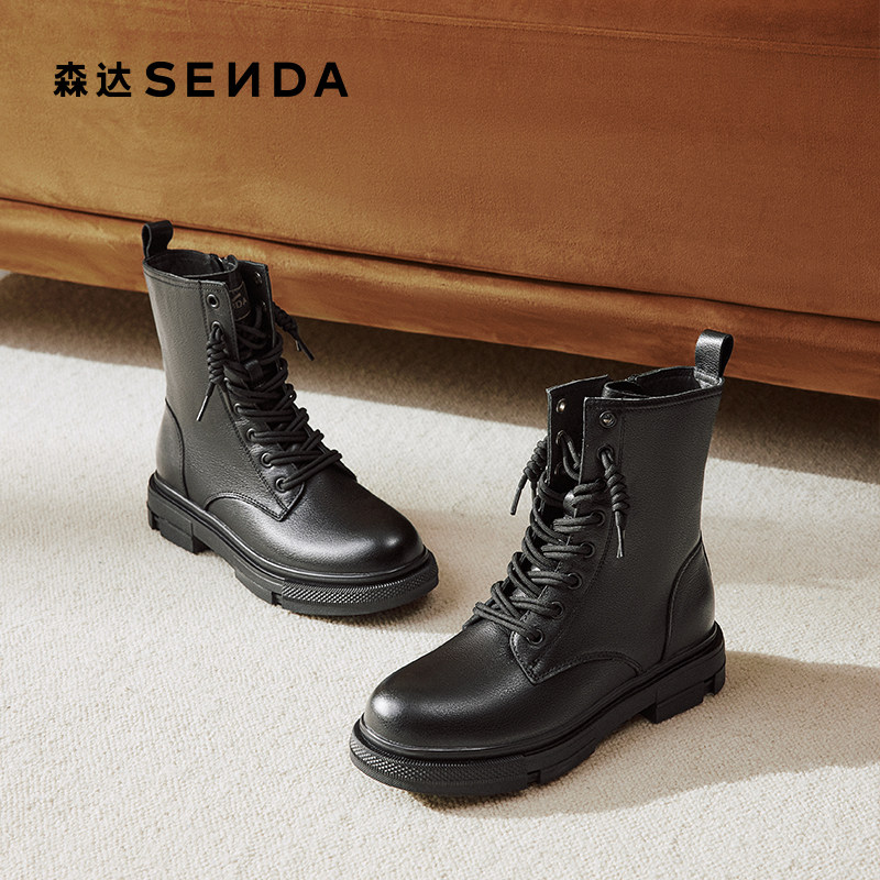 森达真皮马丁靴女冬款商场同款时尚英伦绒里厚底工装中筒靴XEC01