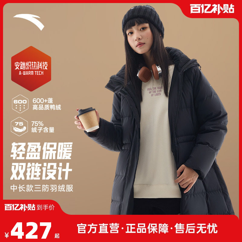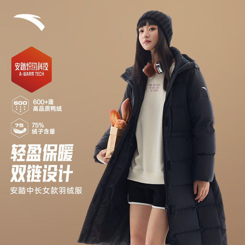 安踏三层速暖羽绒服丨三防中长款鸭绒外套女款冬季面包服棉服