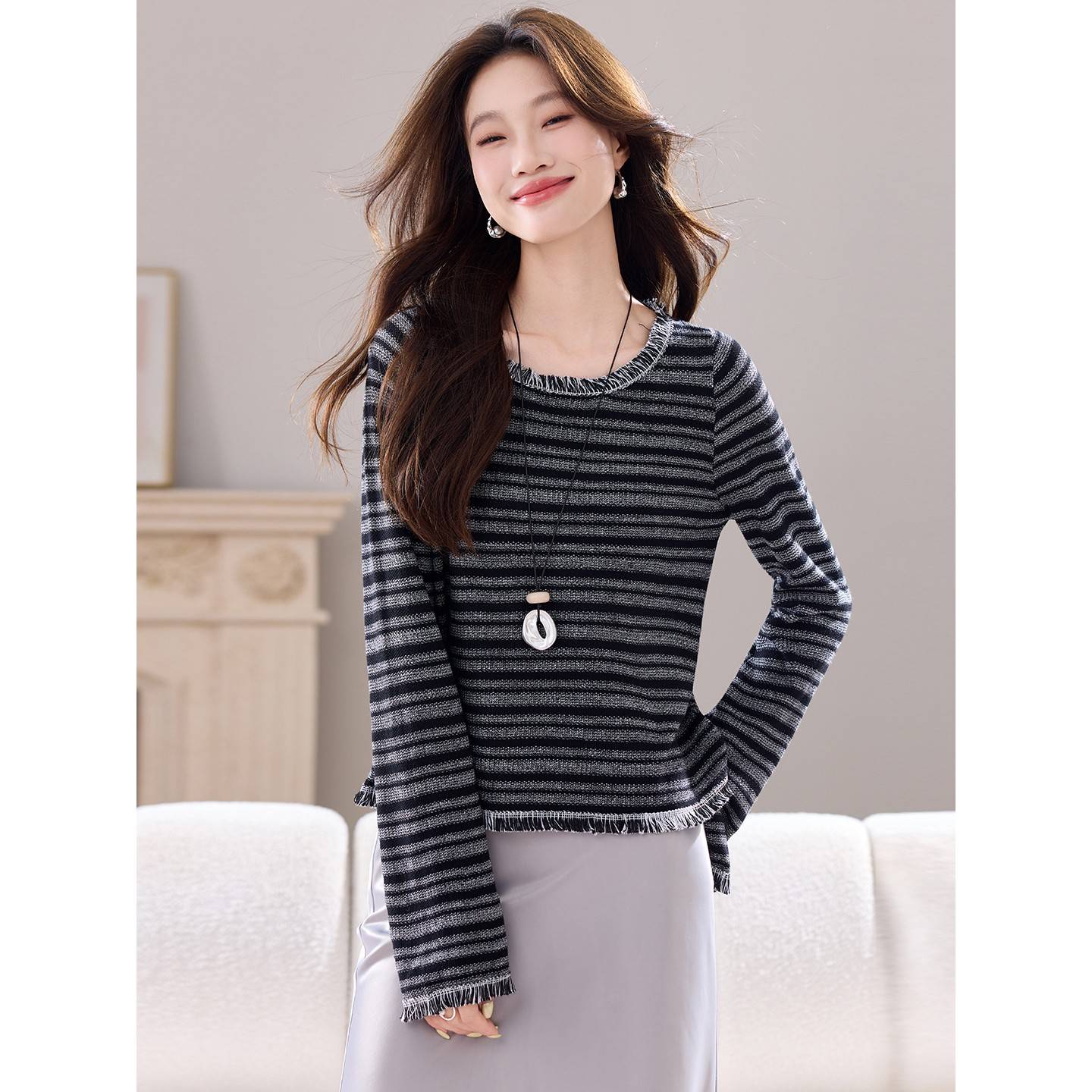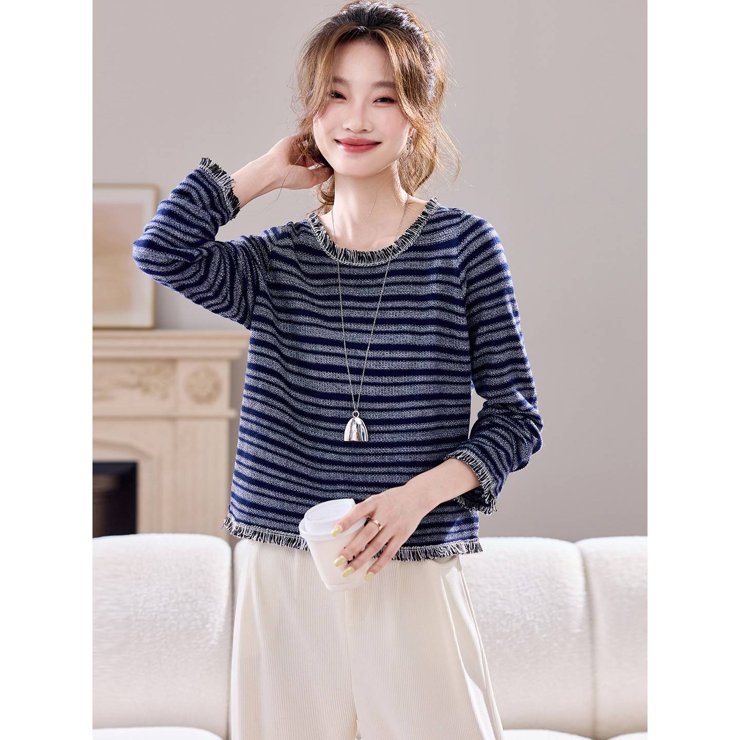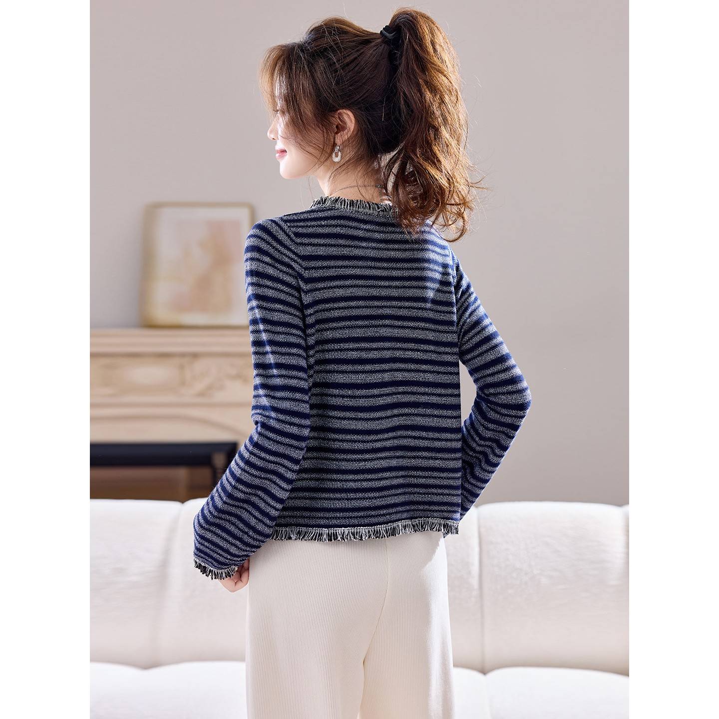 秋季2025新款条纹小香风流苏针织上衣女短款减龄洋气打底针织衫