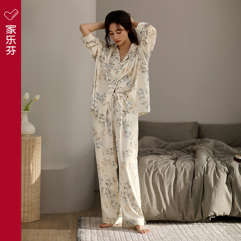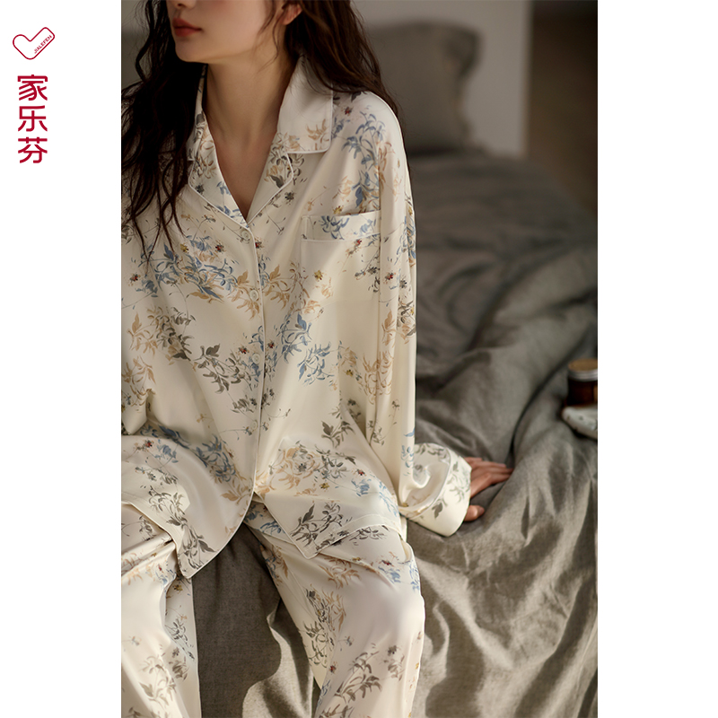 睡衣女士春夏季冰丝长袖家居服女春秋款薄款丝绸仿真丝质碎花套装