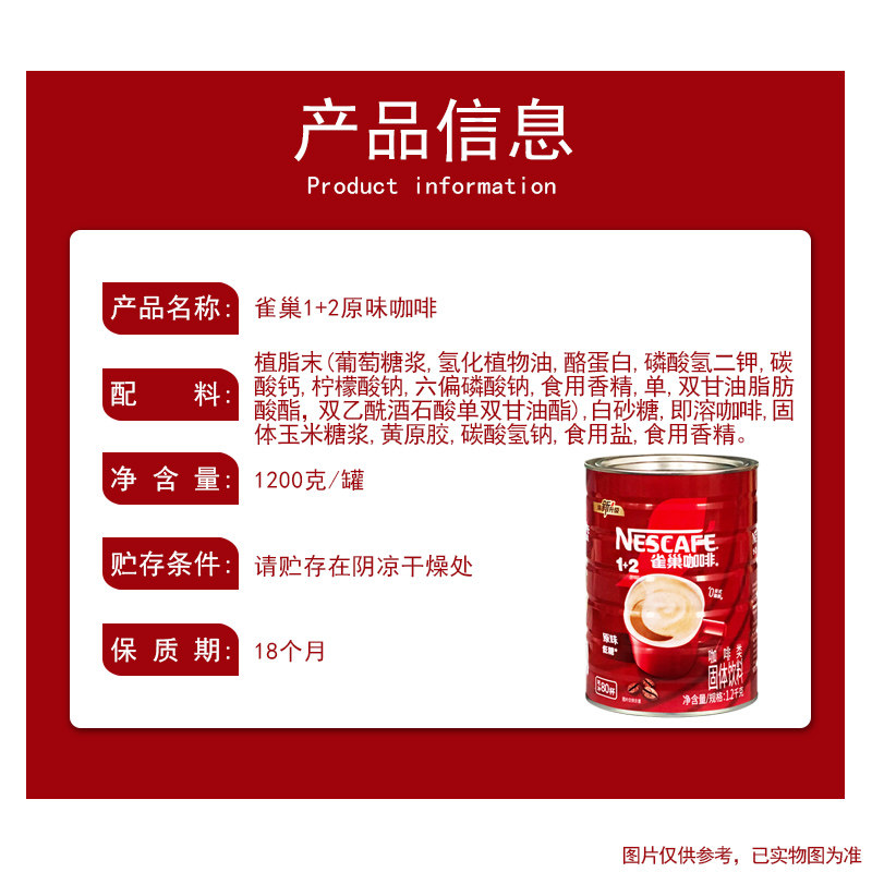 雀巢咖啡速溶咖啡粉1+2醇香原味三合一1200克1.2kg罐装划算装
