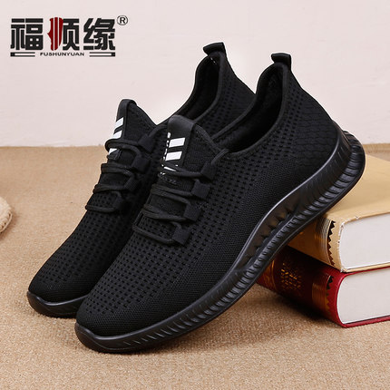 福顺缘春秋透气飞织布面男单鞋 宽松轻软底布鞋 休闲黑色大码男鞋