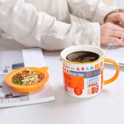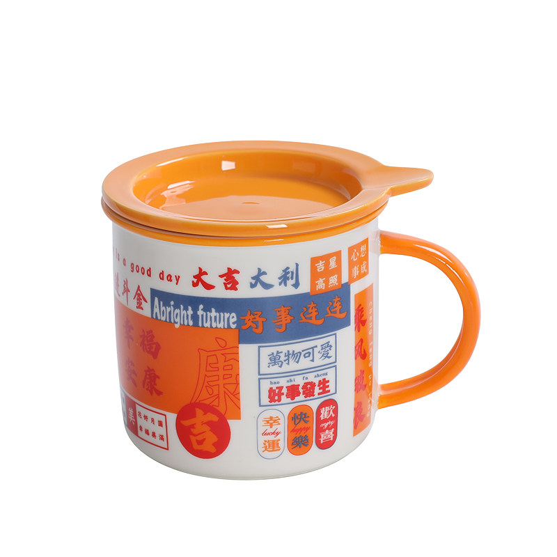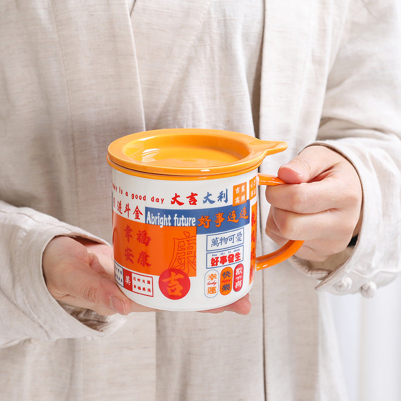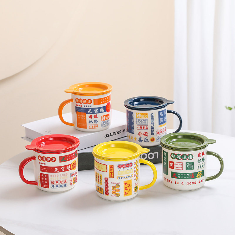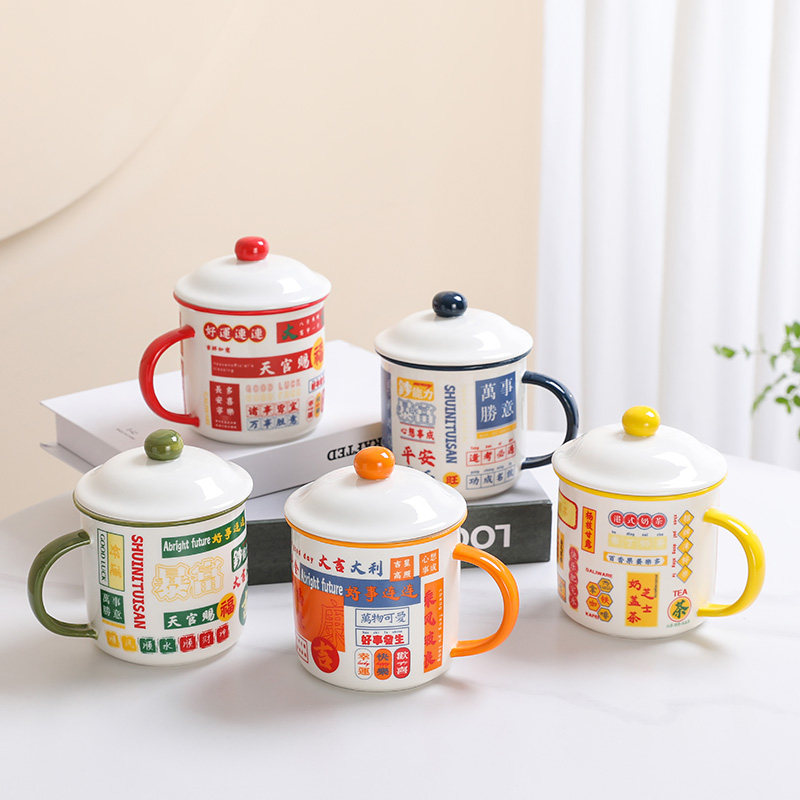 港风复古陶瓷杯仿搪瓷杯茶缸大容量马克杯带盖喜庆男女情侣咖啡杯