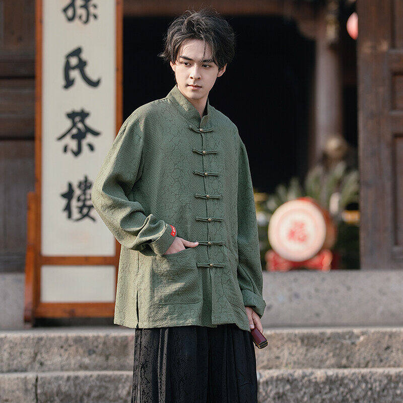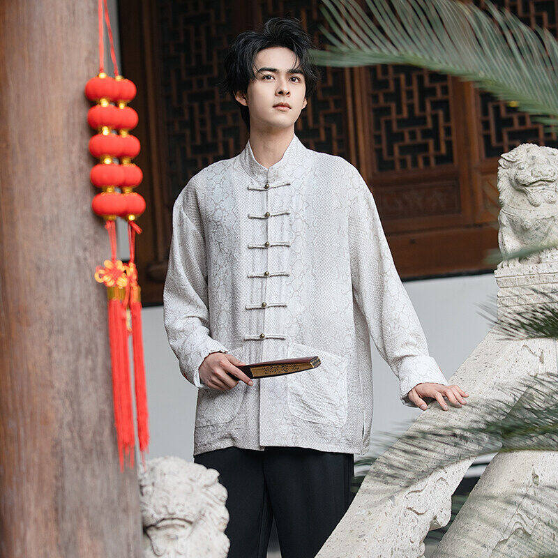 新中式男装中国风复古盘扣衬衫春秋款长袖衬衣蟒纹提花唐装汉服潮