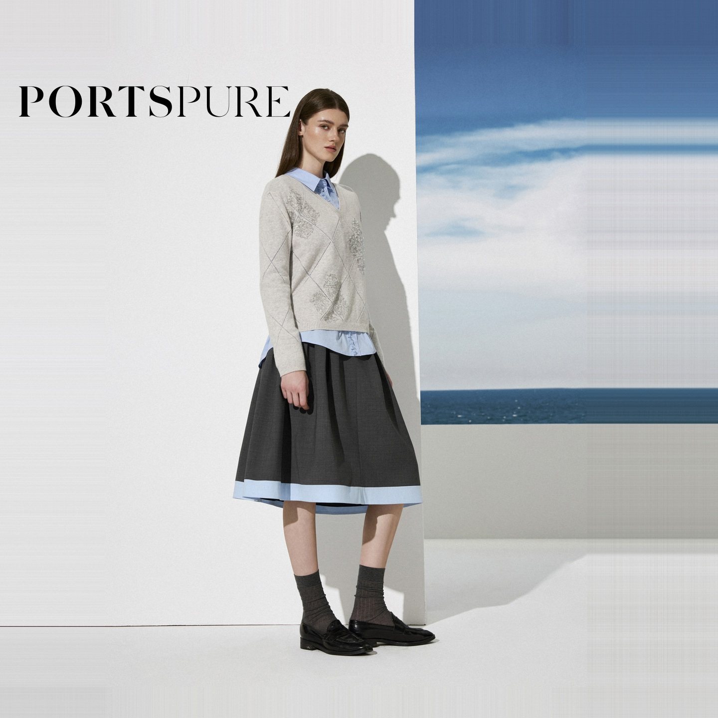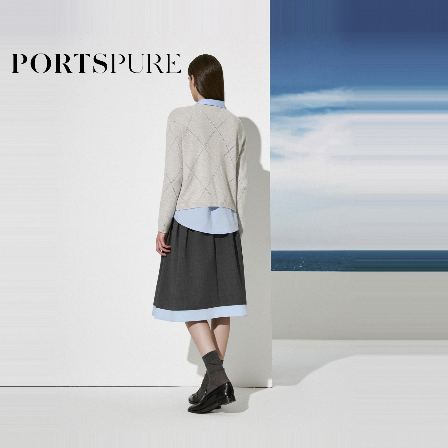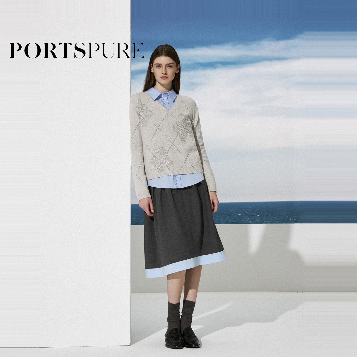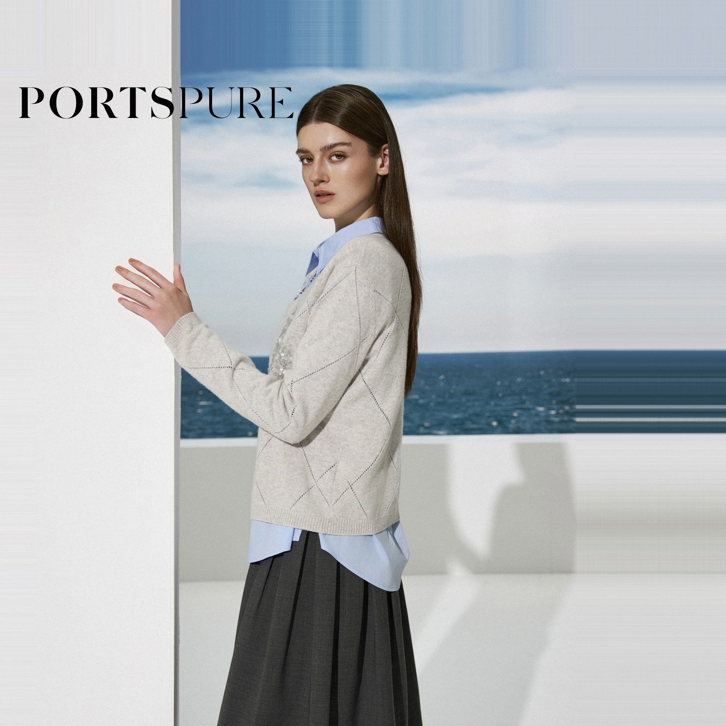 宝姿PORTSPURE女装2026早春新品饰亮片菱格图案V领短款套头毛衫