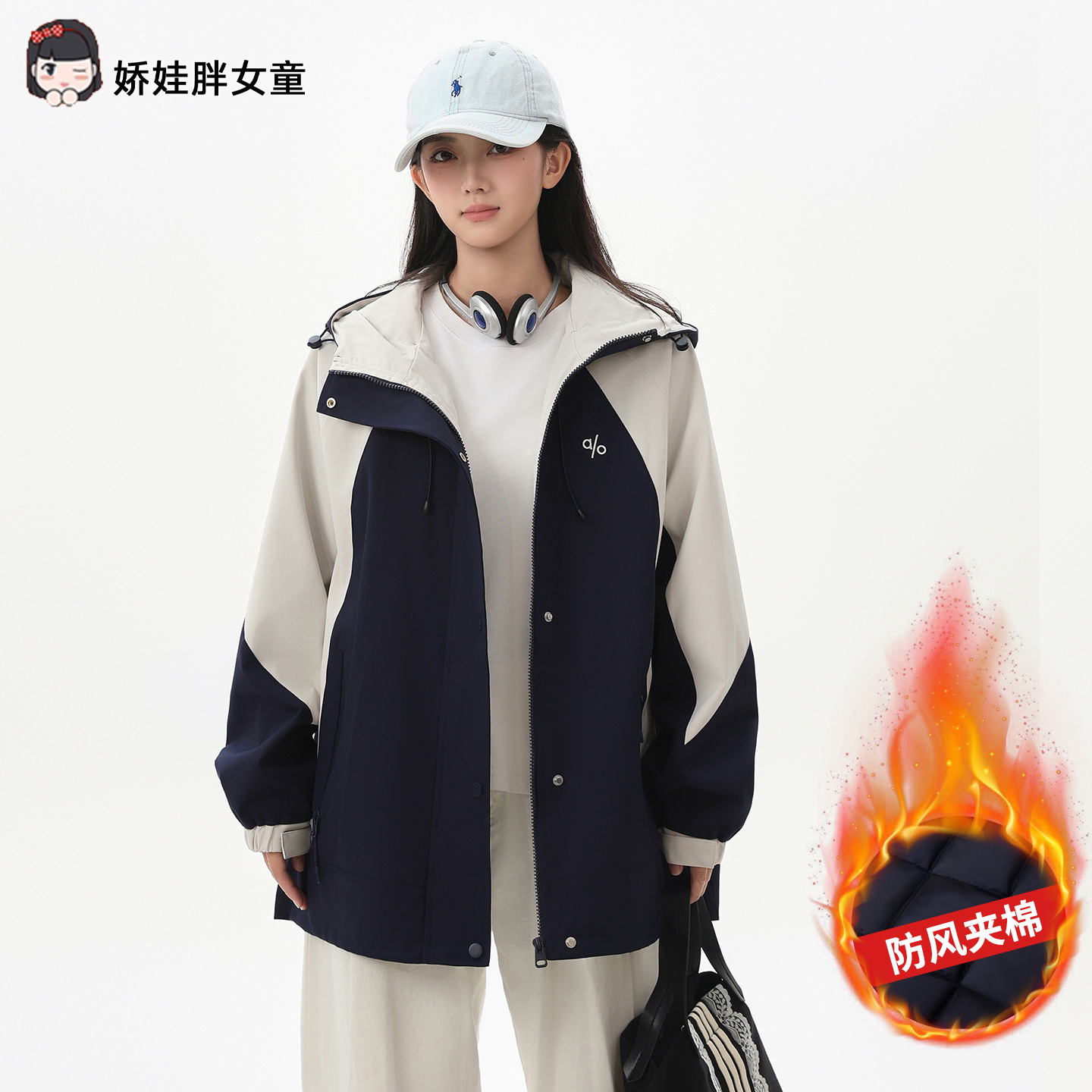 胖女童冲锋衣外套儿童秋冬加肥加大宽松夹棉运动连帽夹克大码棉服