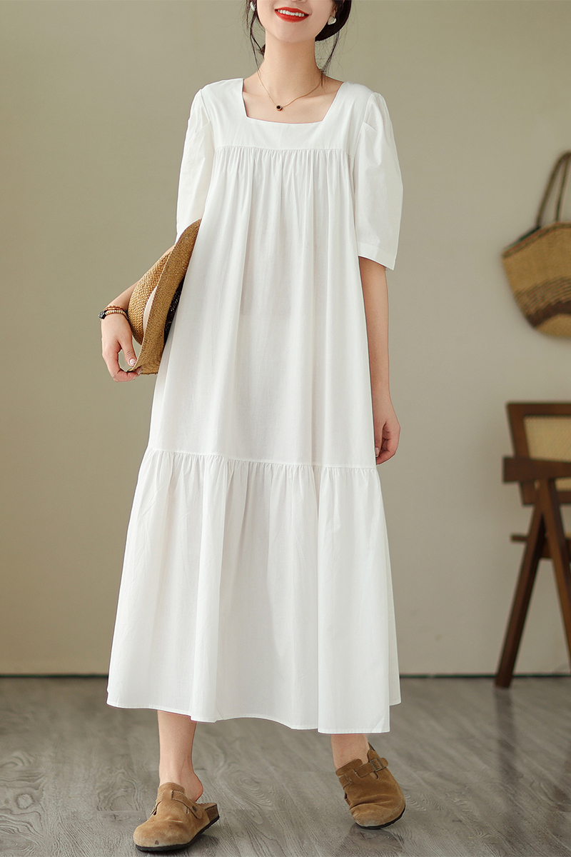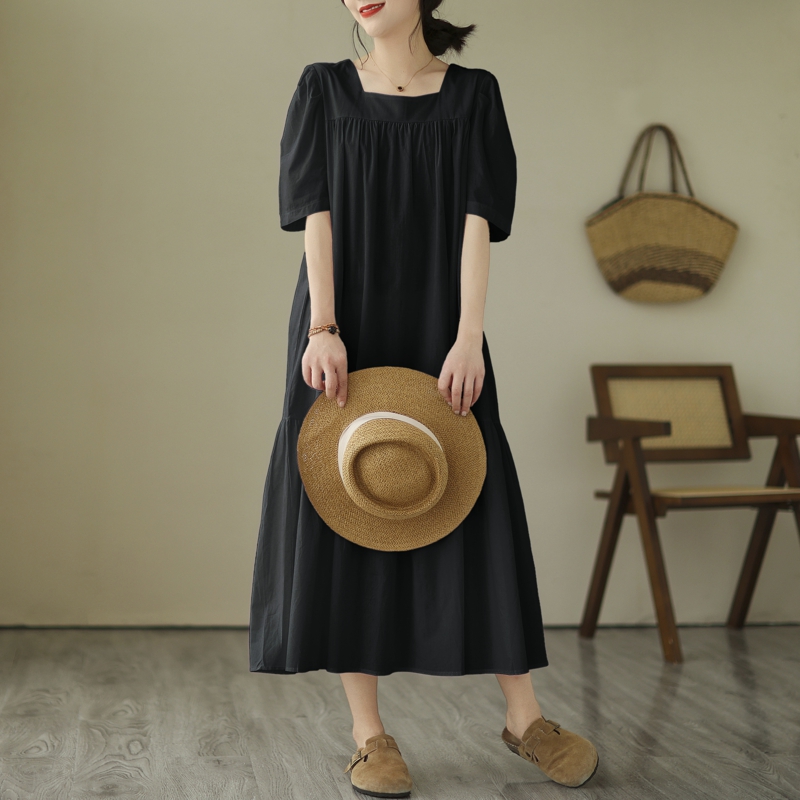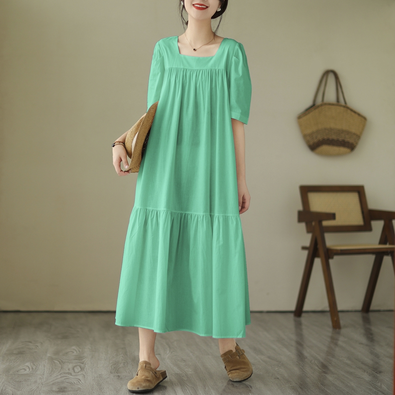 胖mm宽松大码连衣裙女方领糖果色过膝褶皱高腰纯色裙子微胖短袖