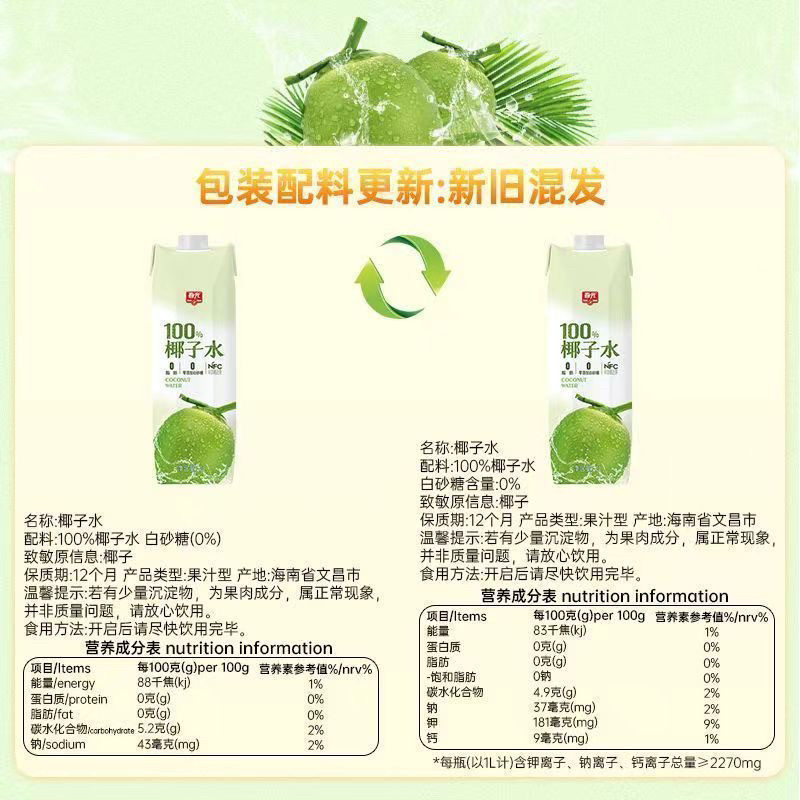 春光椰子水1L新鲜解腻海南特产椰青果汁100%椰子水运动健身饮料