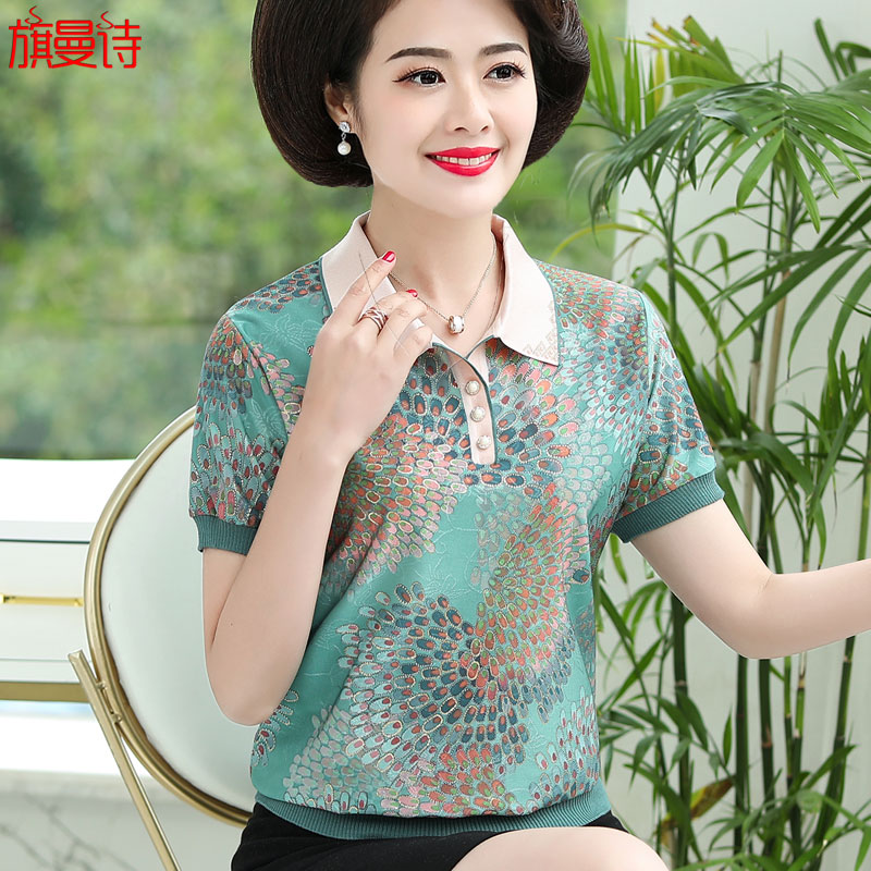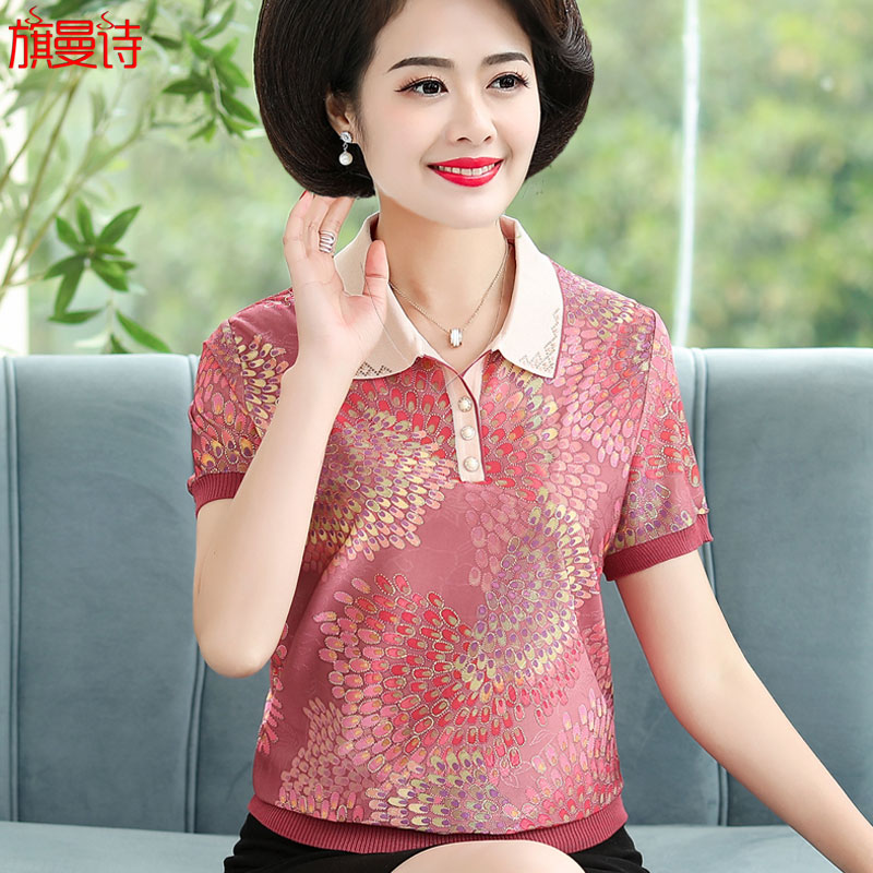 中年妈妈短袖t恤女夏40-50岁新款中老年女夏装翻领大码气质上衣服