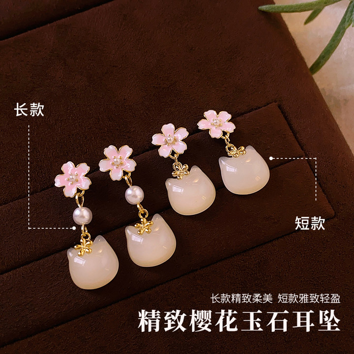 新中式粉色珍珠花朵玉石猫咪耳钉女2025新款爆款流苏耳环国风耳饰