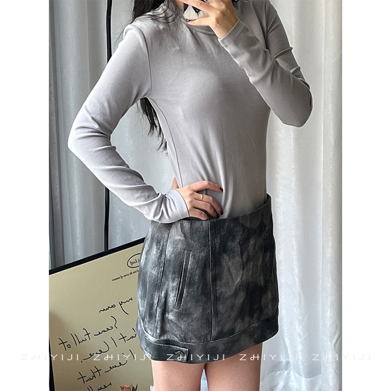 秋季打底圆领修身长袖连衣裙 拼接撞色直筒时髦扎染小个子裙子