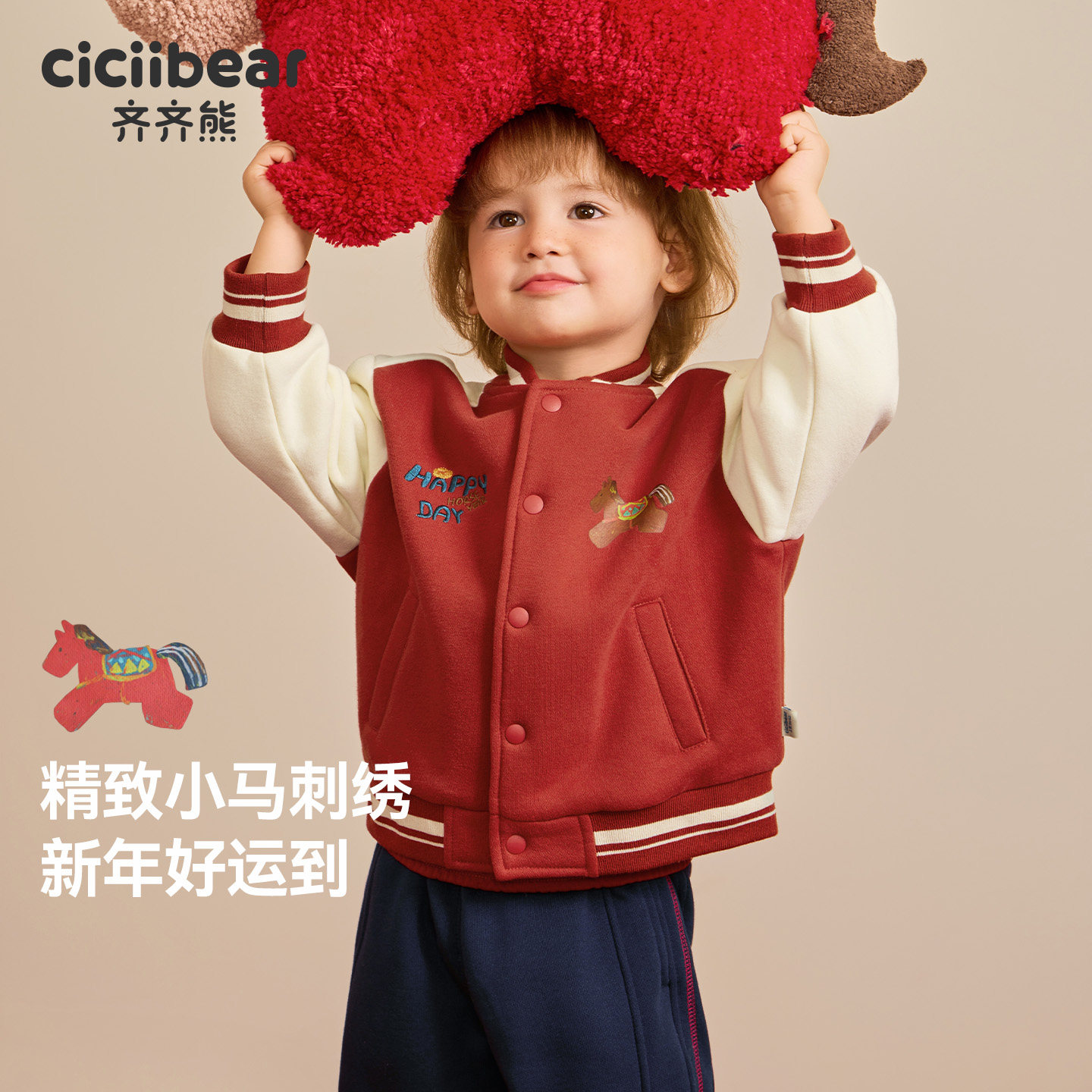 [骏马福裳]齐齐熊宝宝加绒棒球服外套男童红色冬2025新款儿童上衣