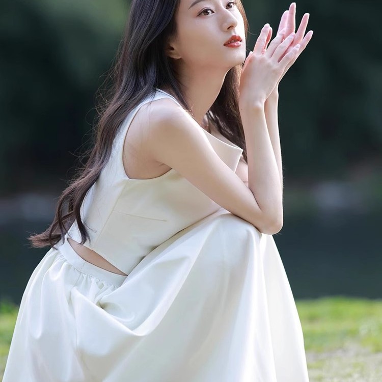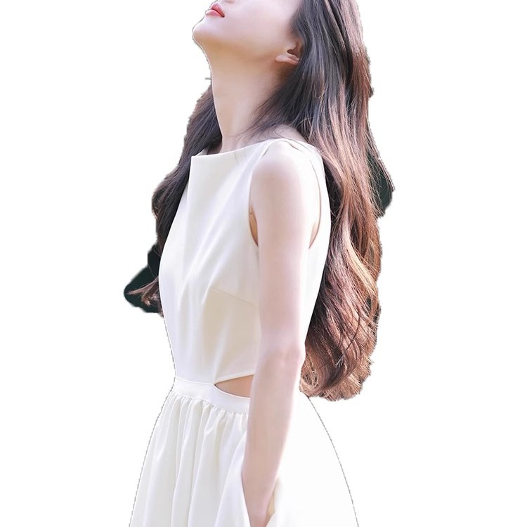 小心机露腰白色无袖背心连衣裙订婚领证礼服公主裙钓系约会裙夏季