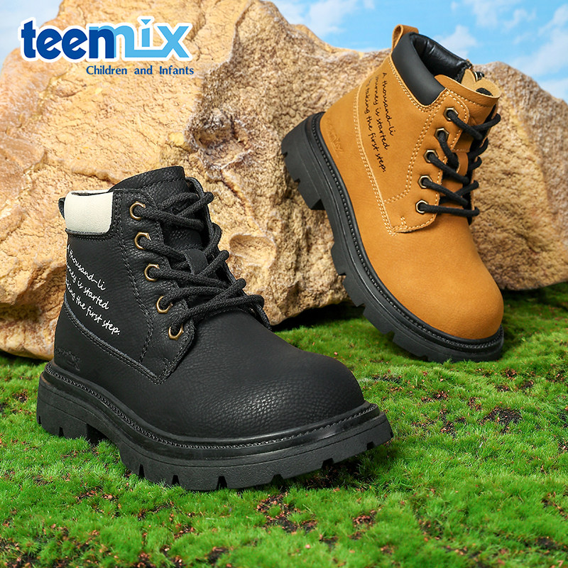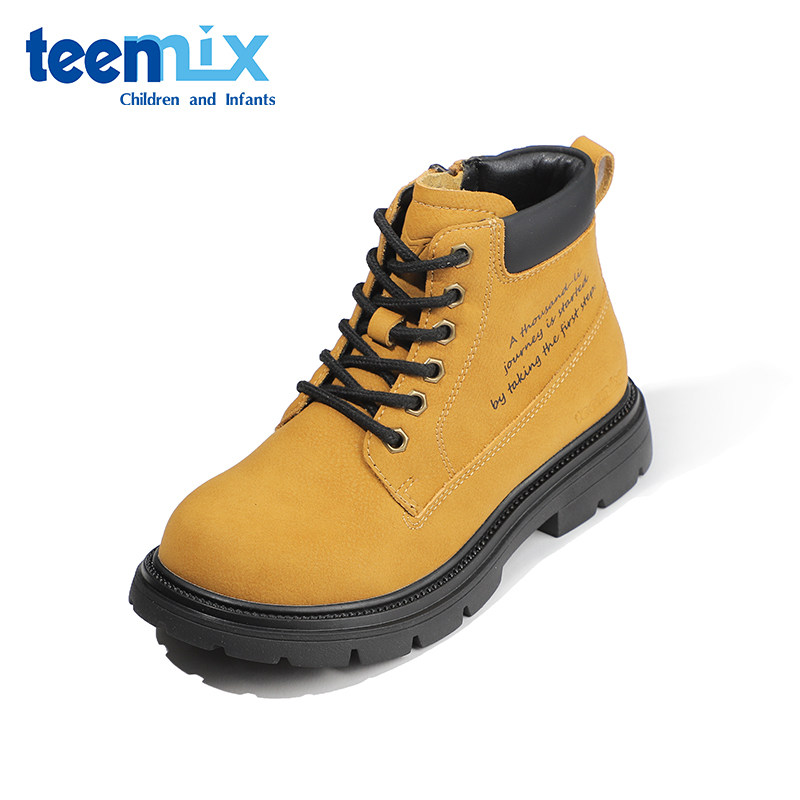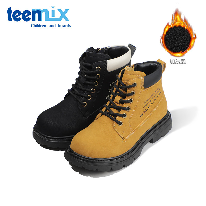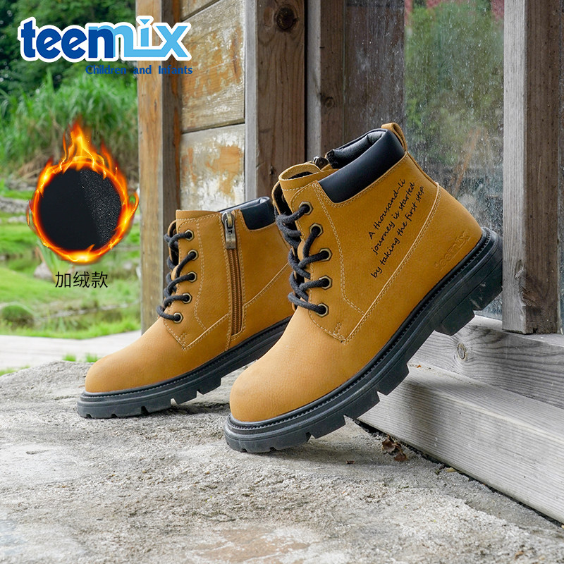 天美意儿童童鞋马丁靴冬季男童工装靴女童加绒保暖防滑软底大黄靴
