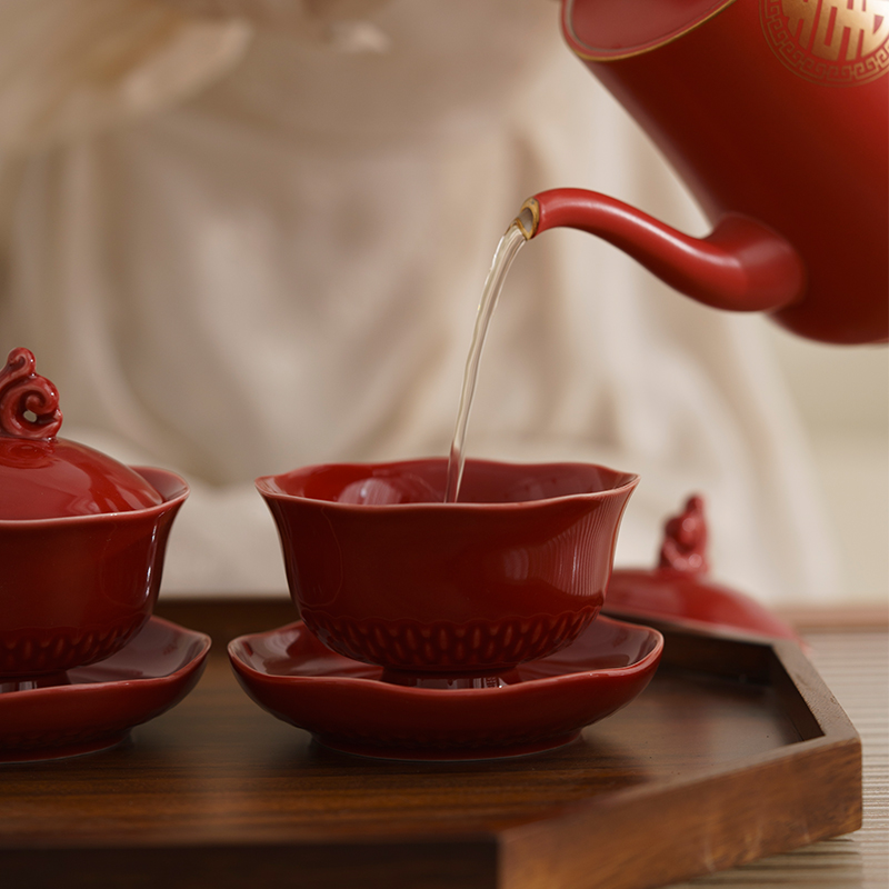 仲夏知己浮雕鳞纹婚礼改口敬茶杯一对新人结婚餐具套装新婚喜碗筷